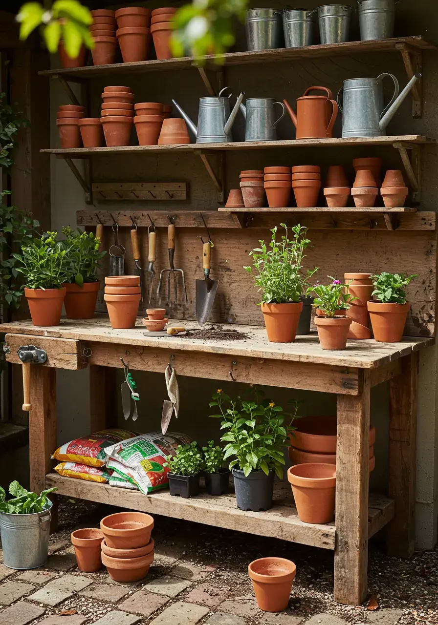 A potting station provides a functional space for garden tasks, making gardening more enjoyable and keeping tools and supplies tidy while adding to the working garden aesthetic.