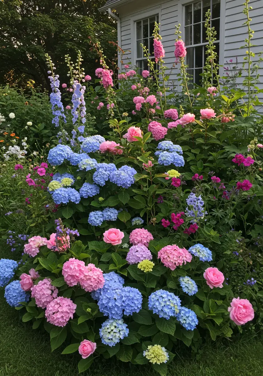 • Plant generous clusters of hydrangeas, roses, and peonies.