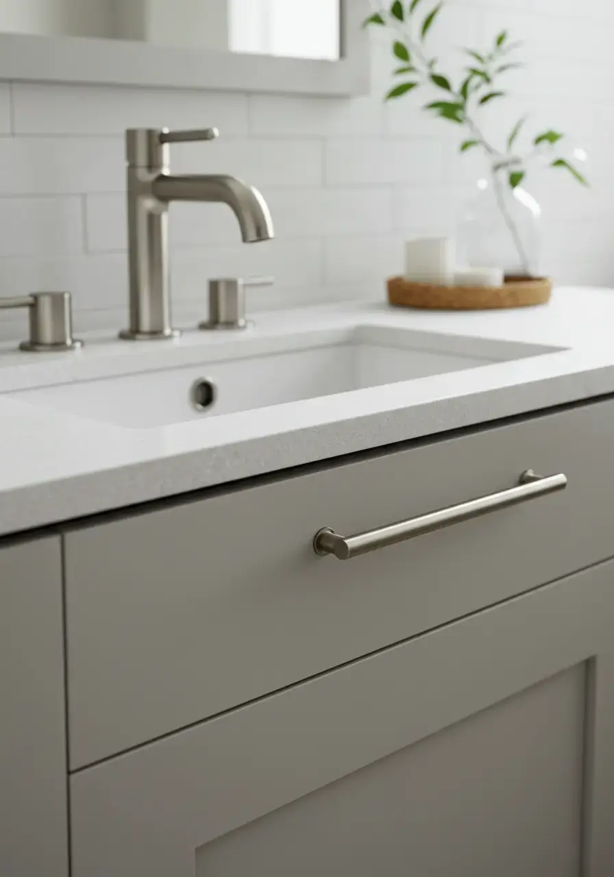 • Select faucets and hardware with simple shapes and finishes like brushed nickel, matte black, or even white.