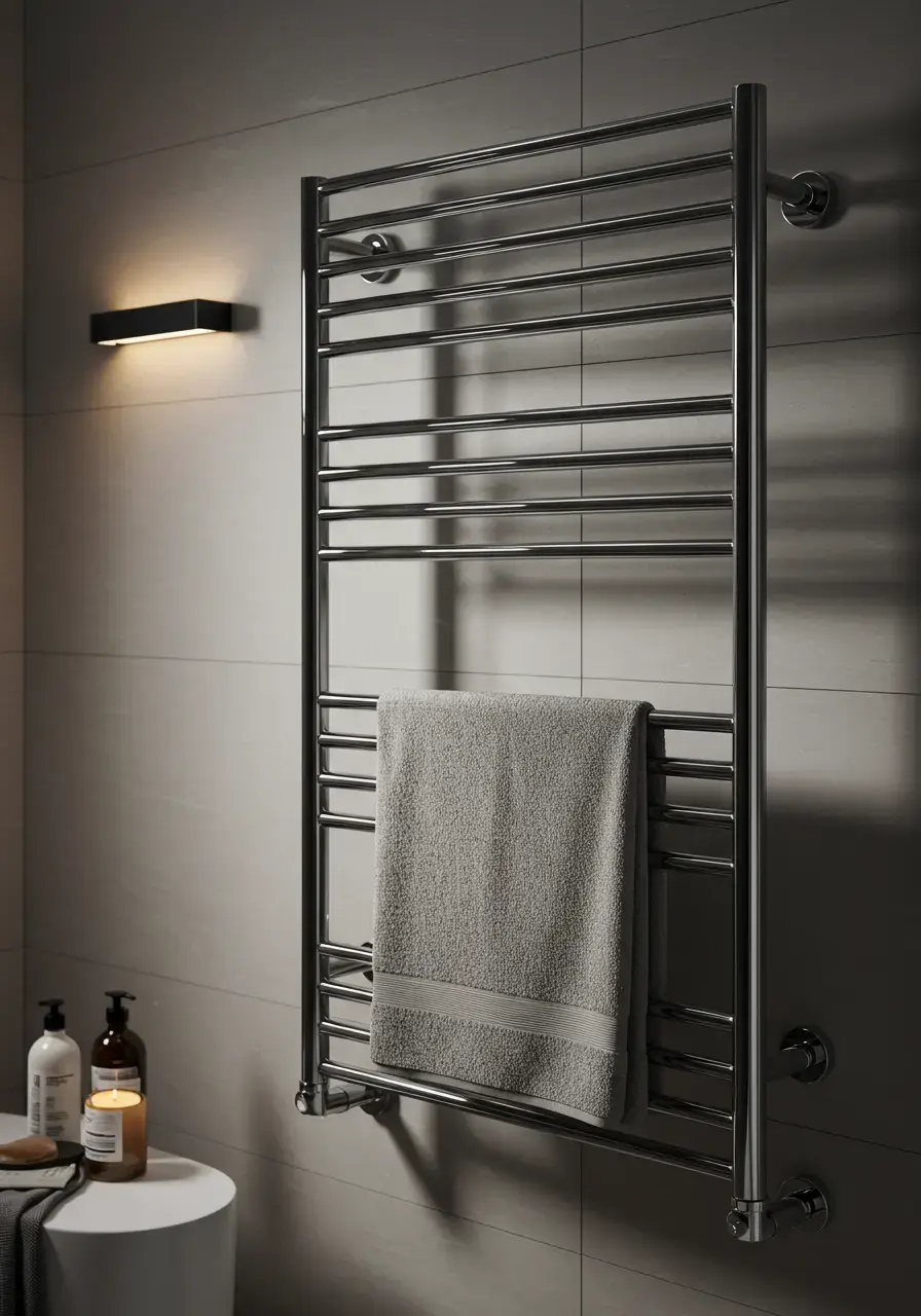 A heated towel rack adds a touch of practical luxury and enhances comfort. It fits the Scandinavian focus on functionality and well-being.