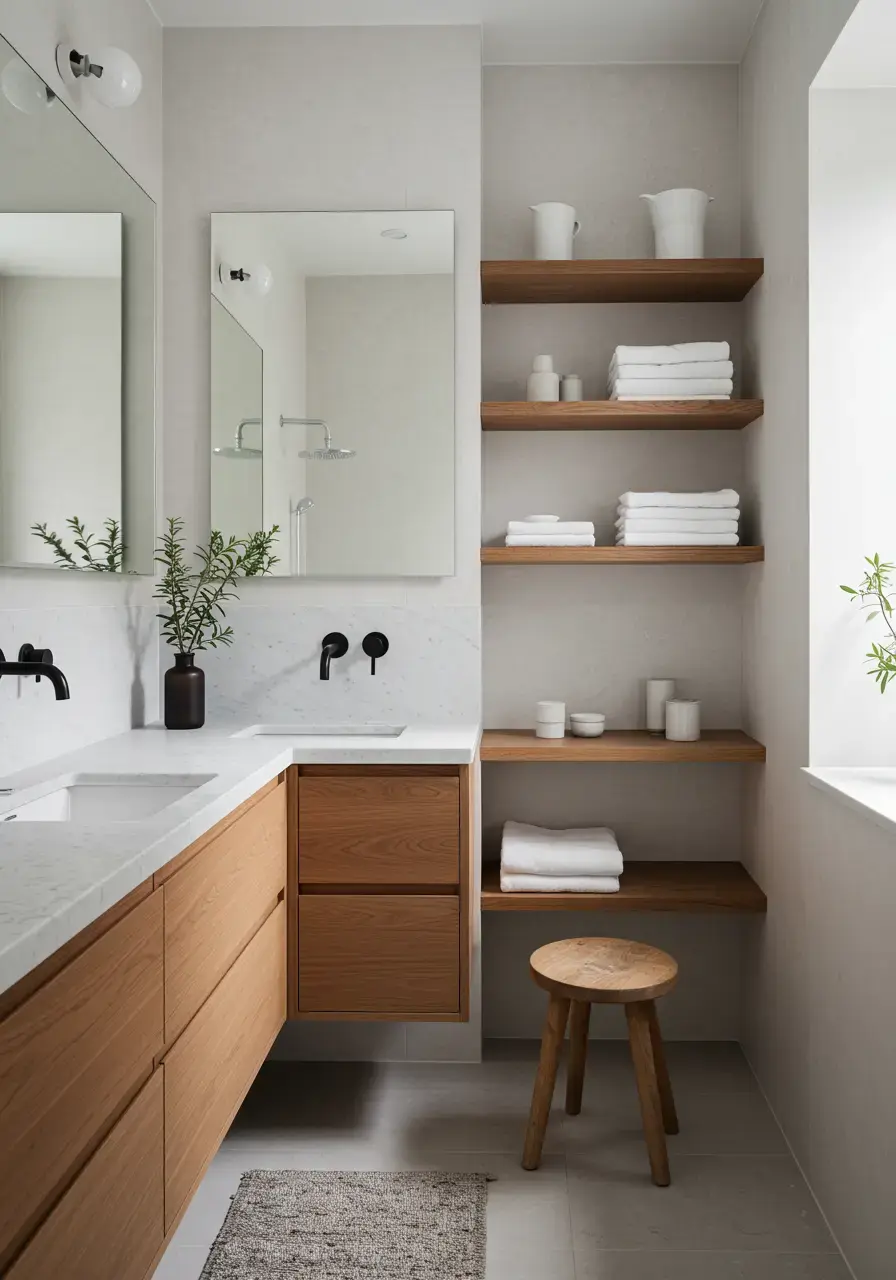 While Scandinavian design often features a pale palette, warm wood tones are essential for adding warmth and a connection to nature. This could be in a vanity, shelving, or even small accessories. My little wood stool is one of my favorite touches; it grounds the space and feels so inviting.