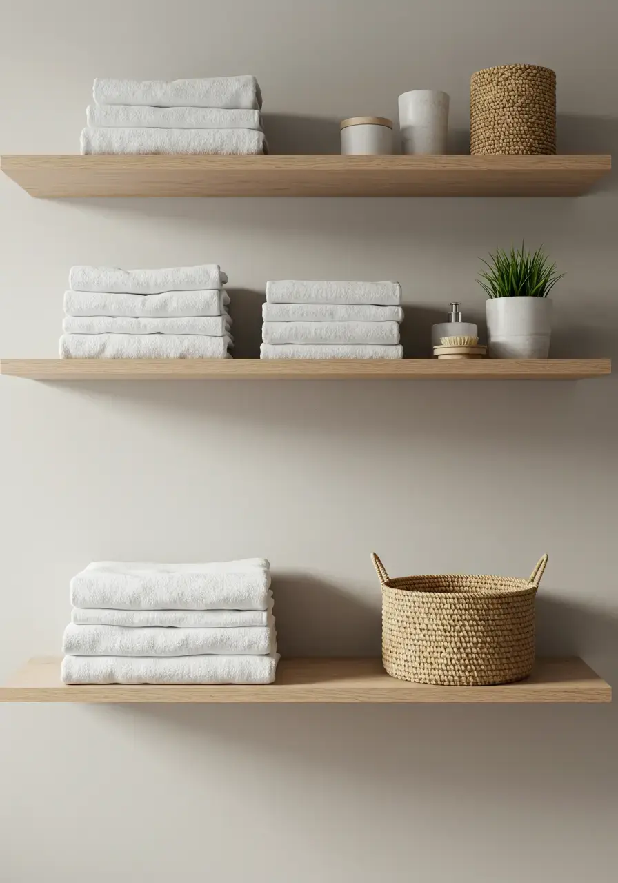 Open shelving is a great way to display beautifully folded towels or carefully chosen decor items while keeping the look light and airy. It’s a practical yet stylish way to add personality and show only your favorite, most beautiful items. I love how open shelves keep the space feeling open.