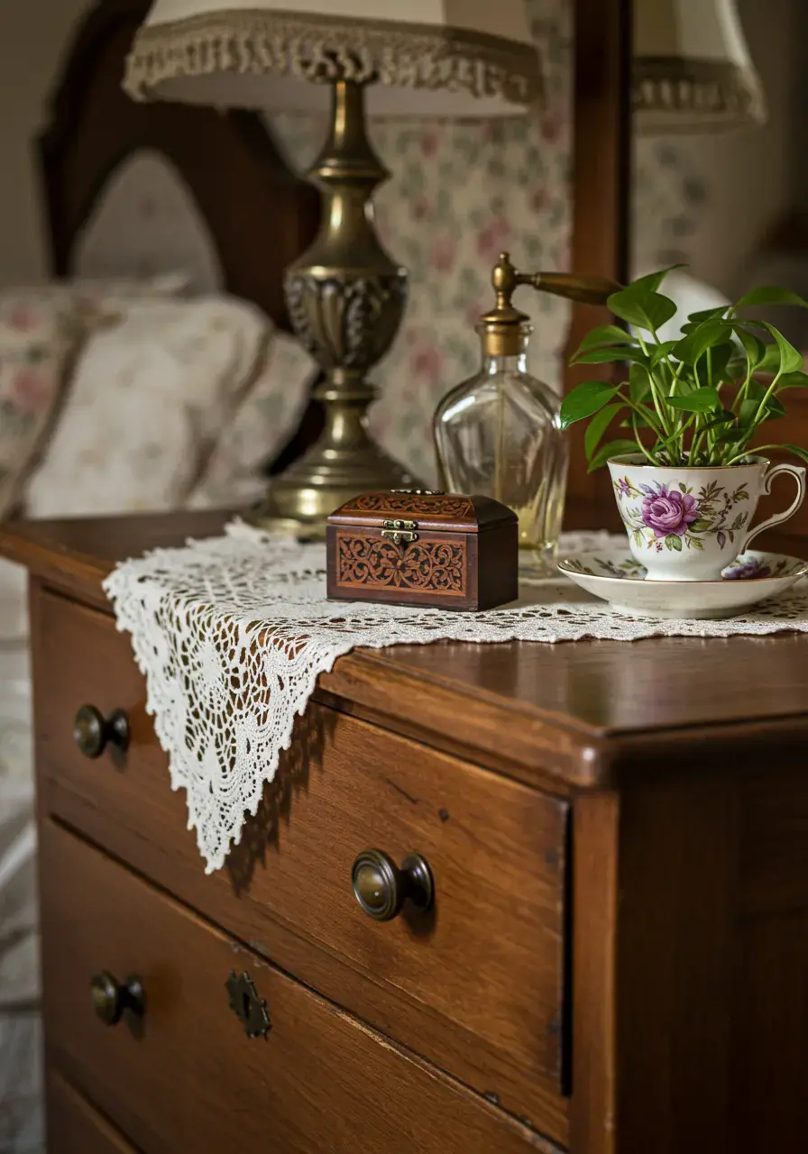 • Place vintage-inspired objects like decorative boxes, perfume bottles, or ceramic figurines on surfaces.