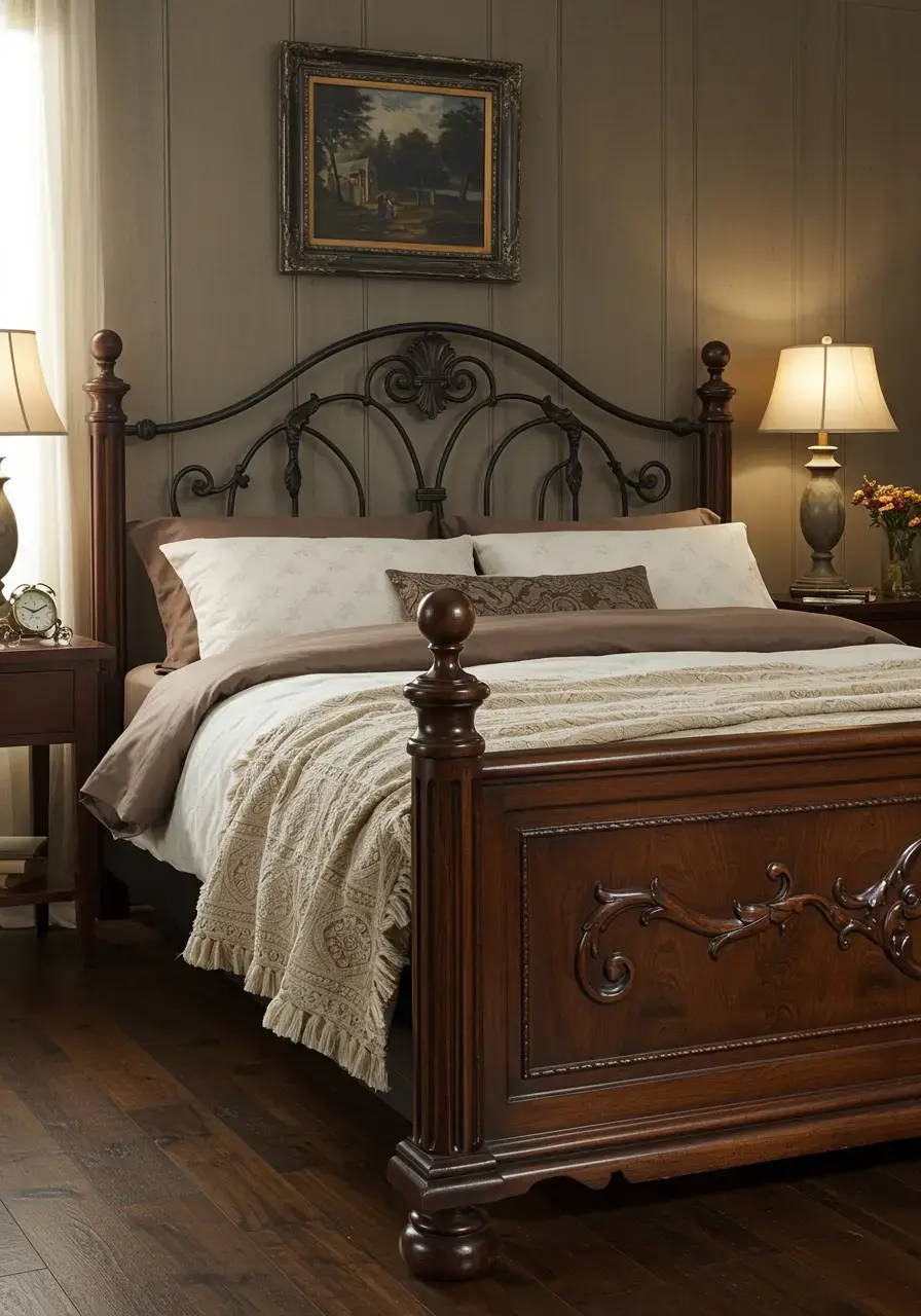 A vintage bed frame acts as an immediate focal point and sets the tone for the entire room’s style. It adds a sense of history and elegance that modern frames often lack.