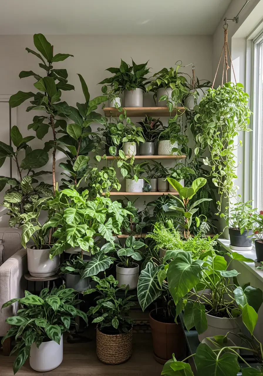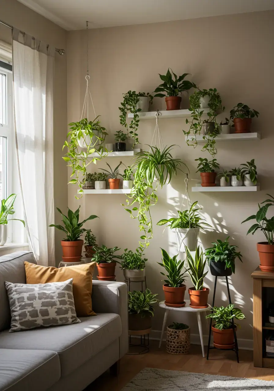 • Install floating shelves or a multi-tiered plant stand to display several plants vertically.