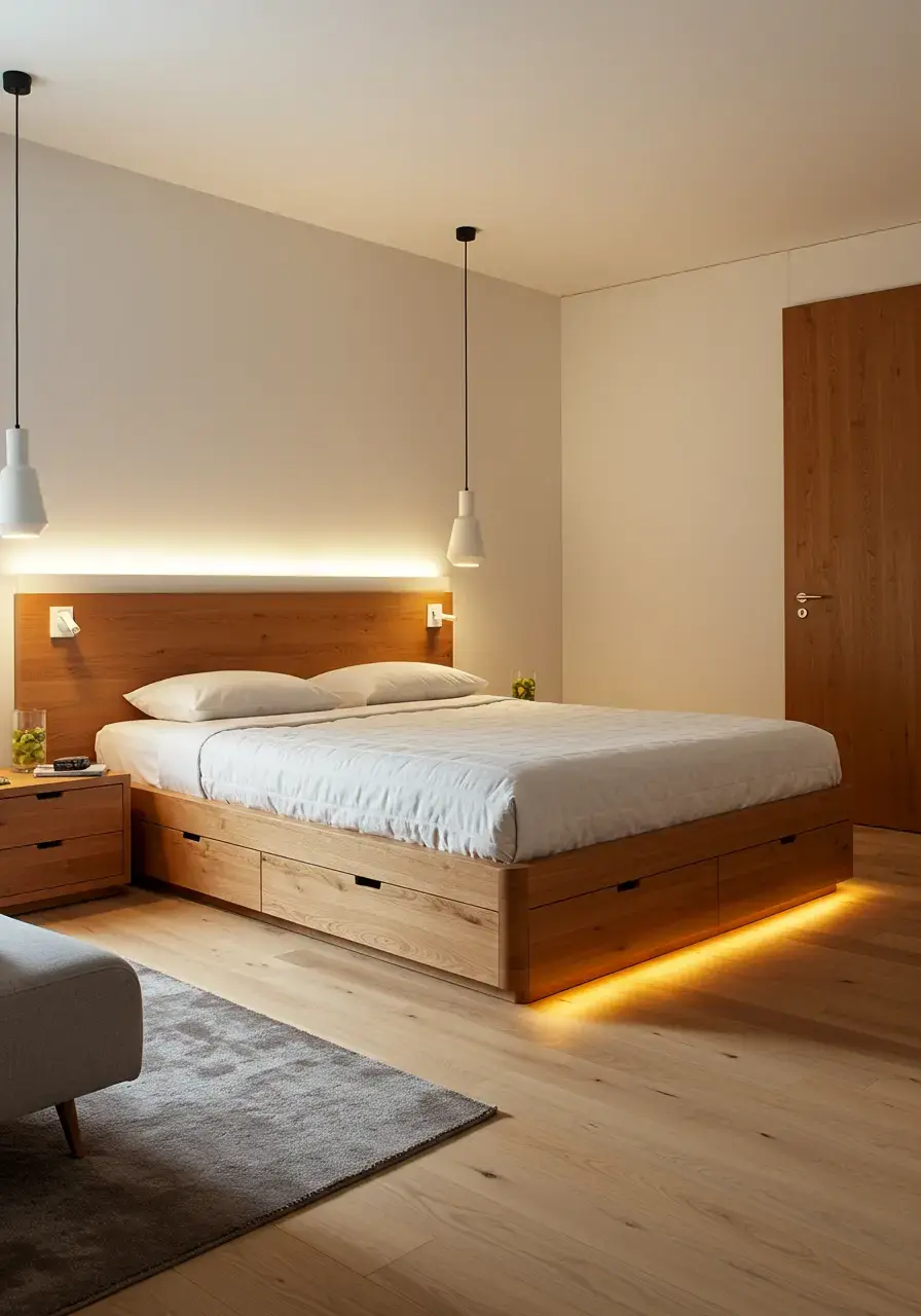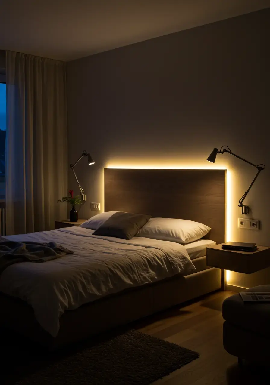 • Add warm-toned LED strip lighting behind headboards or under floating nightstands for a soft, ambient glow.