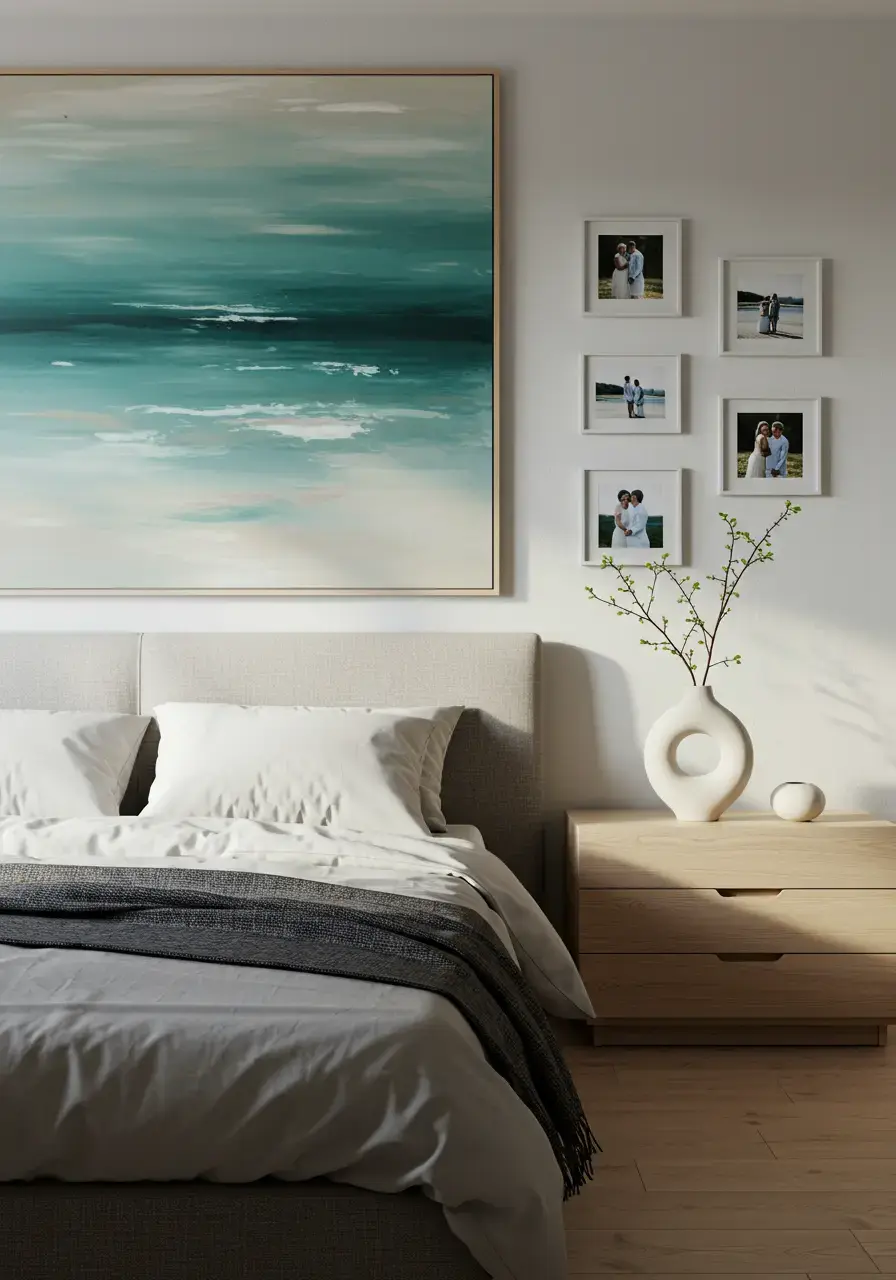 • Select a large, calming piece of abstract art or a serene landscape print to be a focal point above the bed.