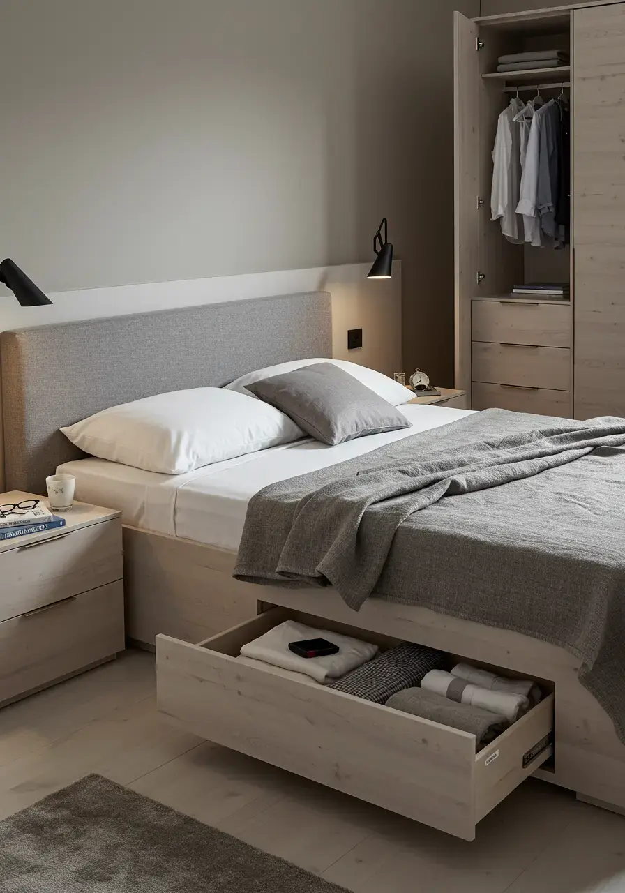 • Choose a bed frame with integrated drawers or lift-up storage for linens and seasonal items.