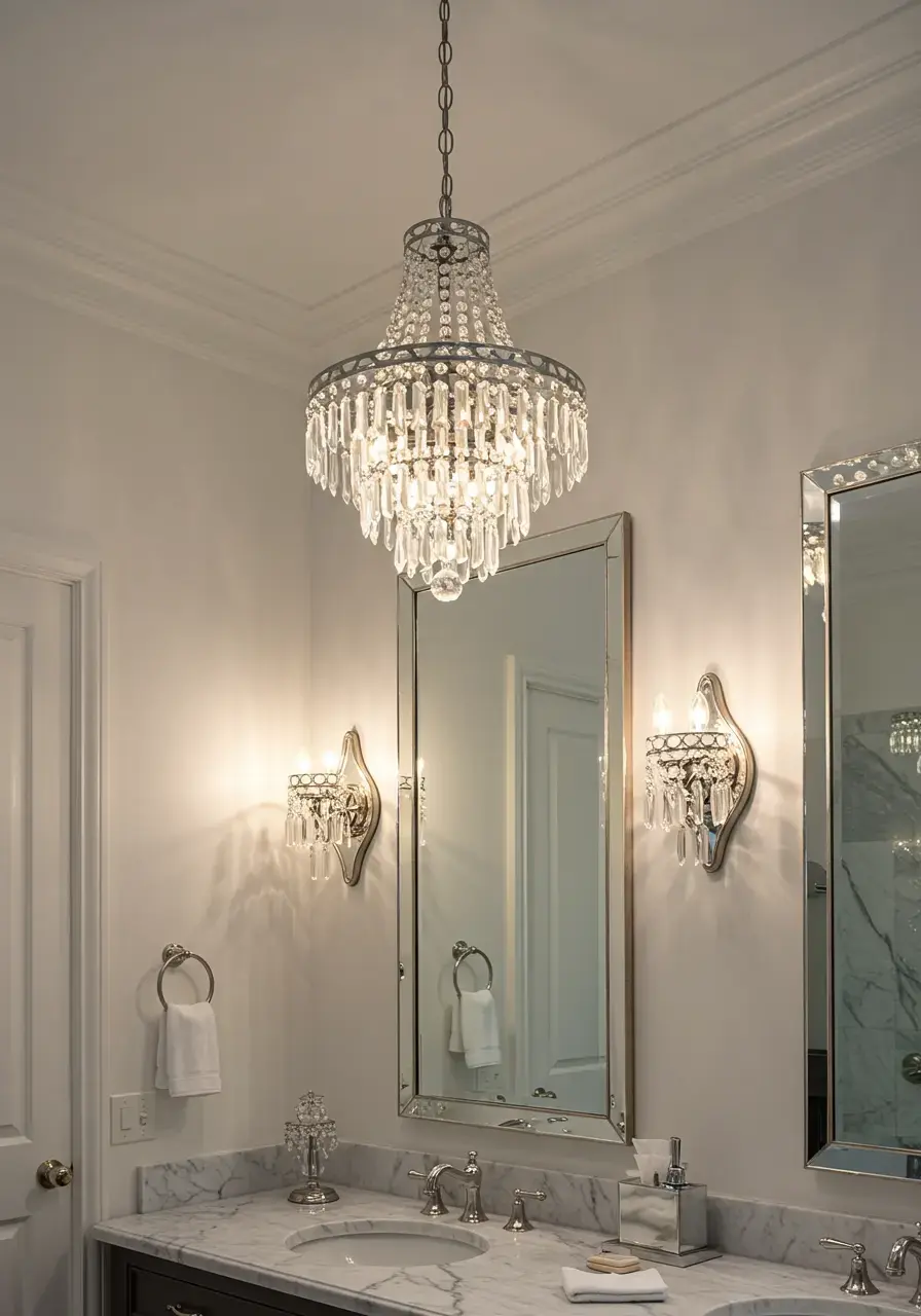 • Consider a small chandelier or pendant light if your bathroom size and ceiling height allow for a statement.