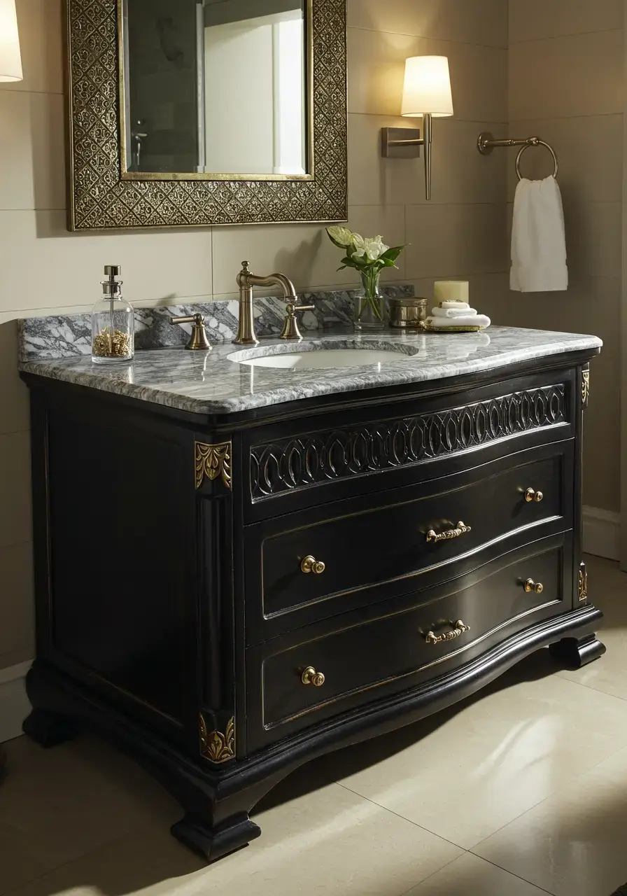 A dramatic vanity serves as a major focal point and adds significant style and personality to the bathroom. It provides essential storage while contributing to the luxurious aesthetic.