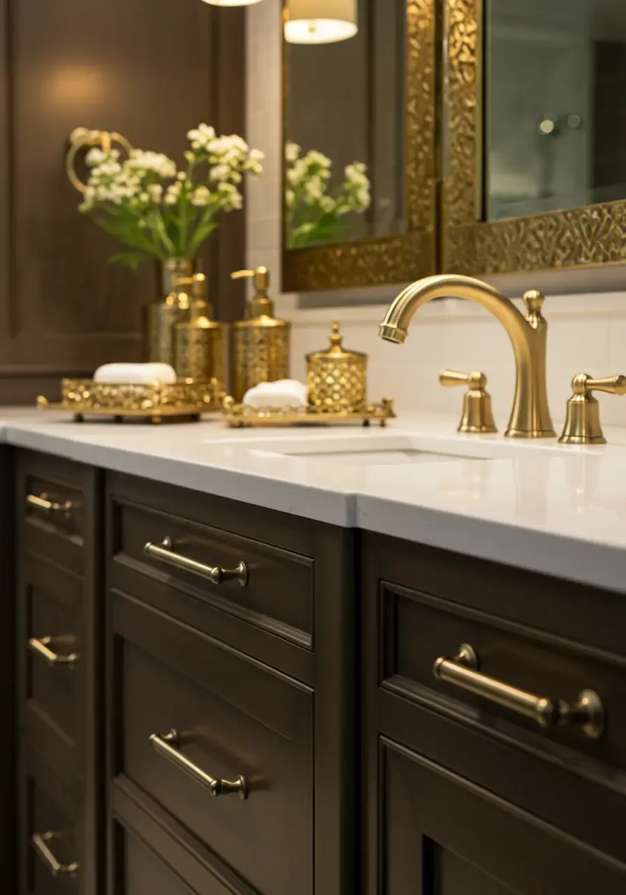 • Choose hardware like faucets, drawer pulls, and towel bars in finishes like brass, gold, chrome, or polished nickel.