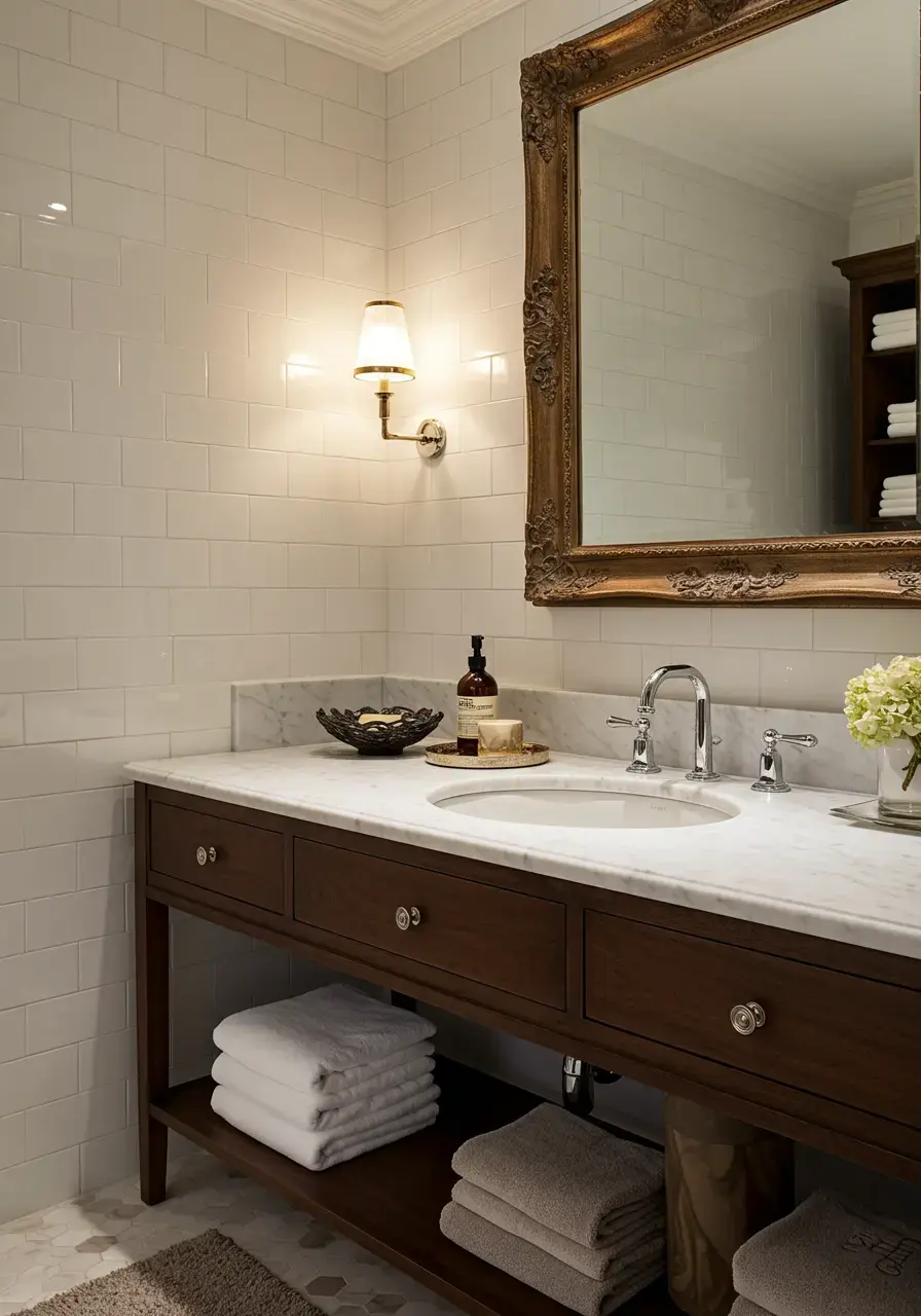 • Combine materials like glossy tiles, polished stone countertops, and mirrored surfaces with plush rugs, soft towels, and upholstered elements.