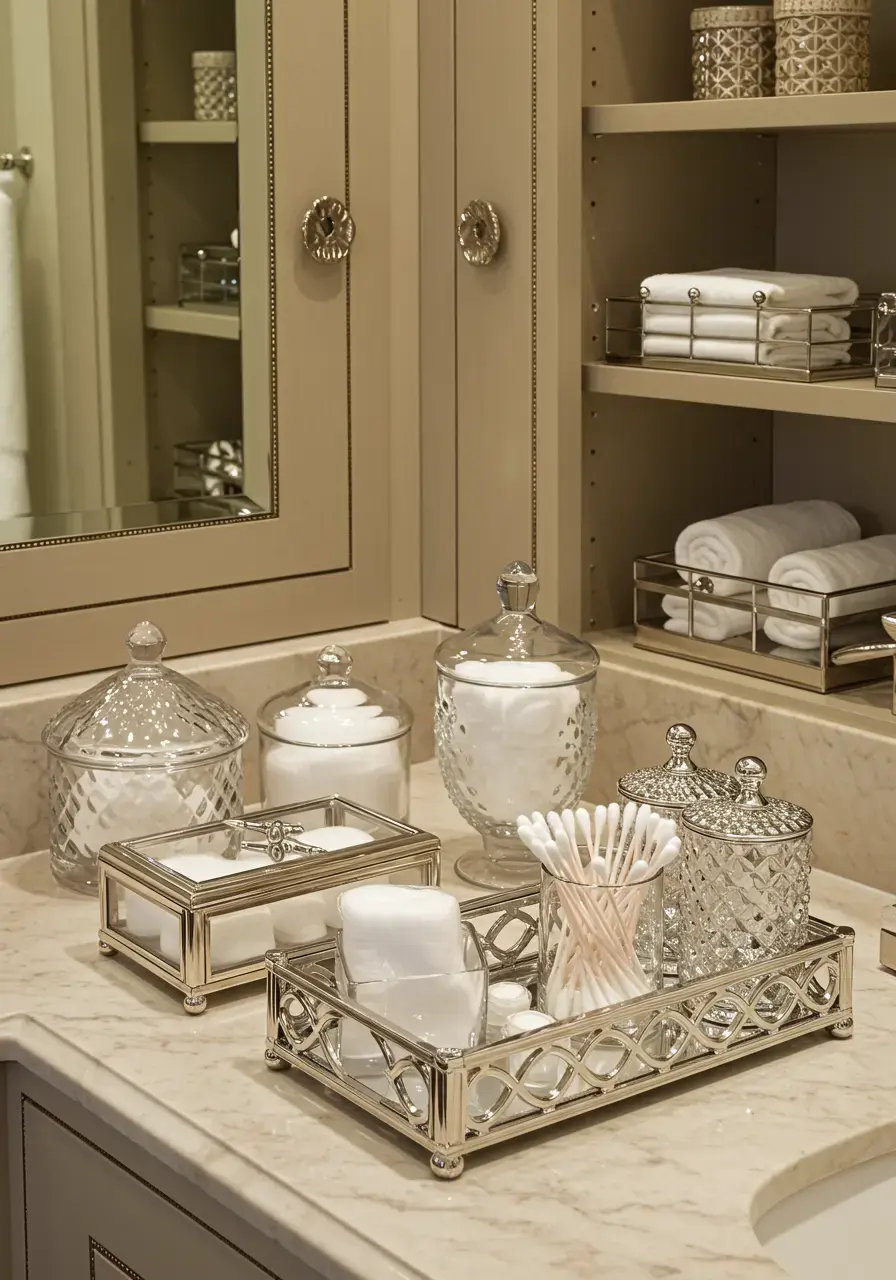 Chic storage keeps the space organized and tidy, maintaining the luxurious and serene atmosphere of a glam bathroom. The storage pieces themselves can also serve as decorative elements.