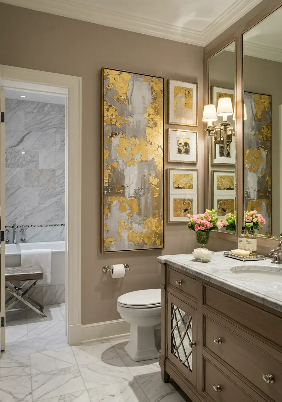 Glamorous wall art adds visual interest, color, and personality to the space. It helps to complete the look and makes the bathroom feel more curated and intentional.