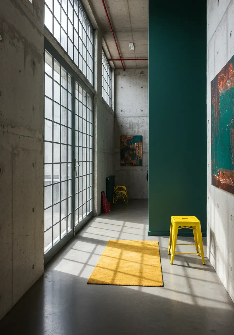 • Introduce pops of vibrant color through industrial-inspired art or accessories, like a bright yellow metal stool.