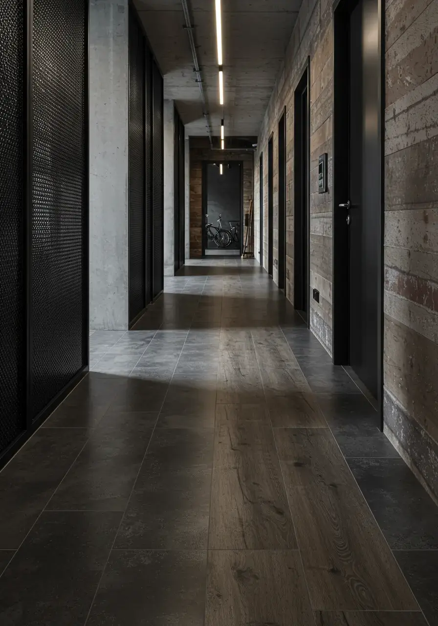The right flooring provides a robust and authentic base for the industrial aesthetic, is durable against high traffic, and visually connects the hallway to the overall design theme.