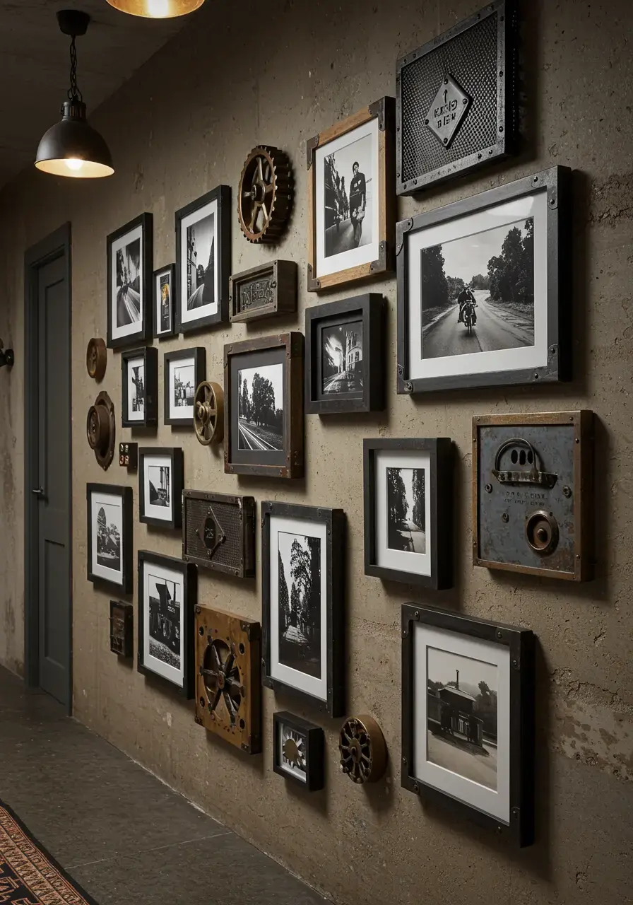 • Intersperse actual metal objects like vintage gears, small industrial signs, or metal mesh panels within your photo arrangement.