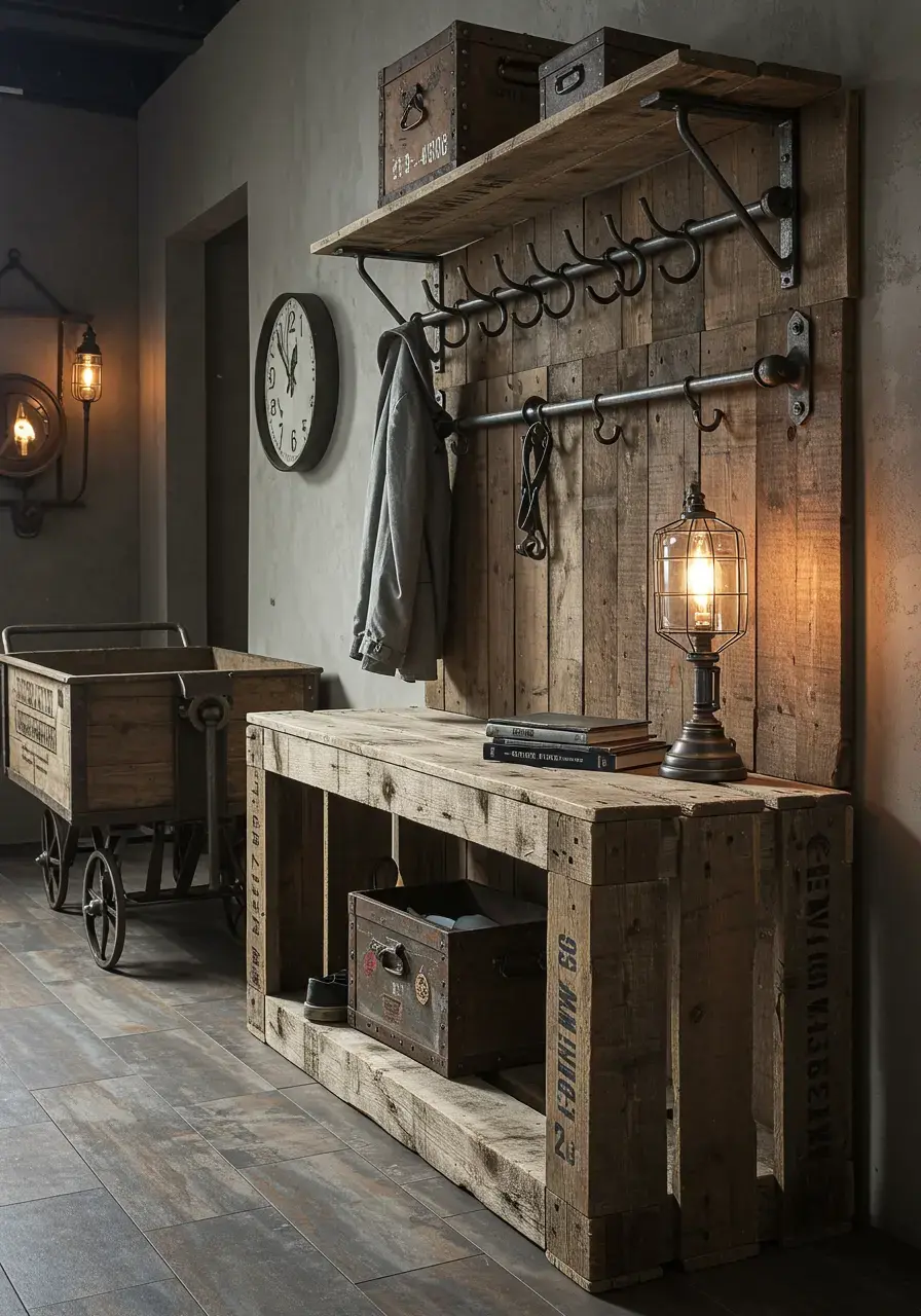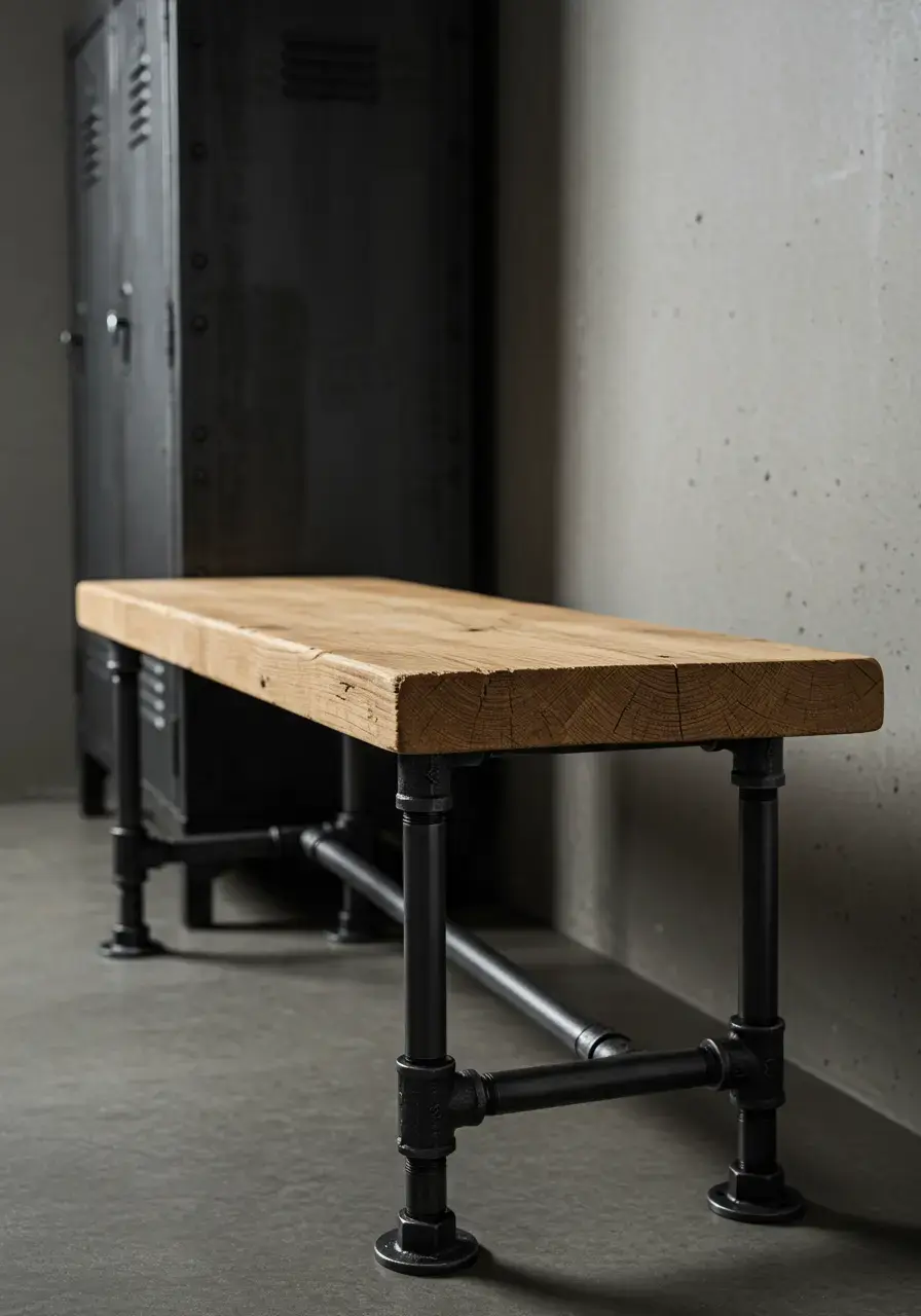 A DIY industrial bench offers practical seating and storage, adds a personalized, handmade touch, and becomes a strong focal point that grounds the industrial aesthetic in your hallway.