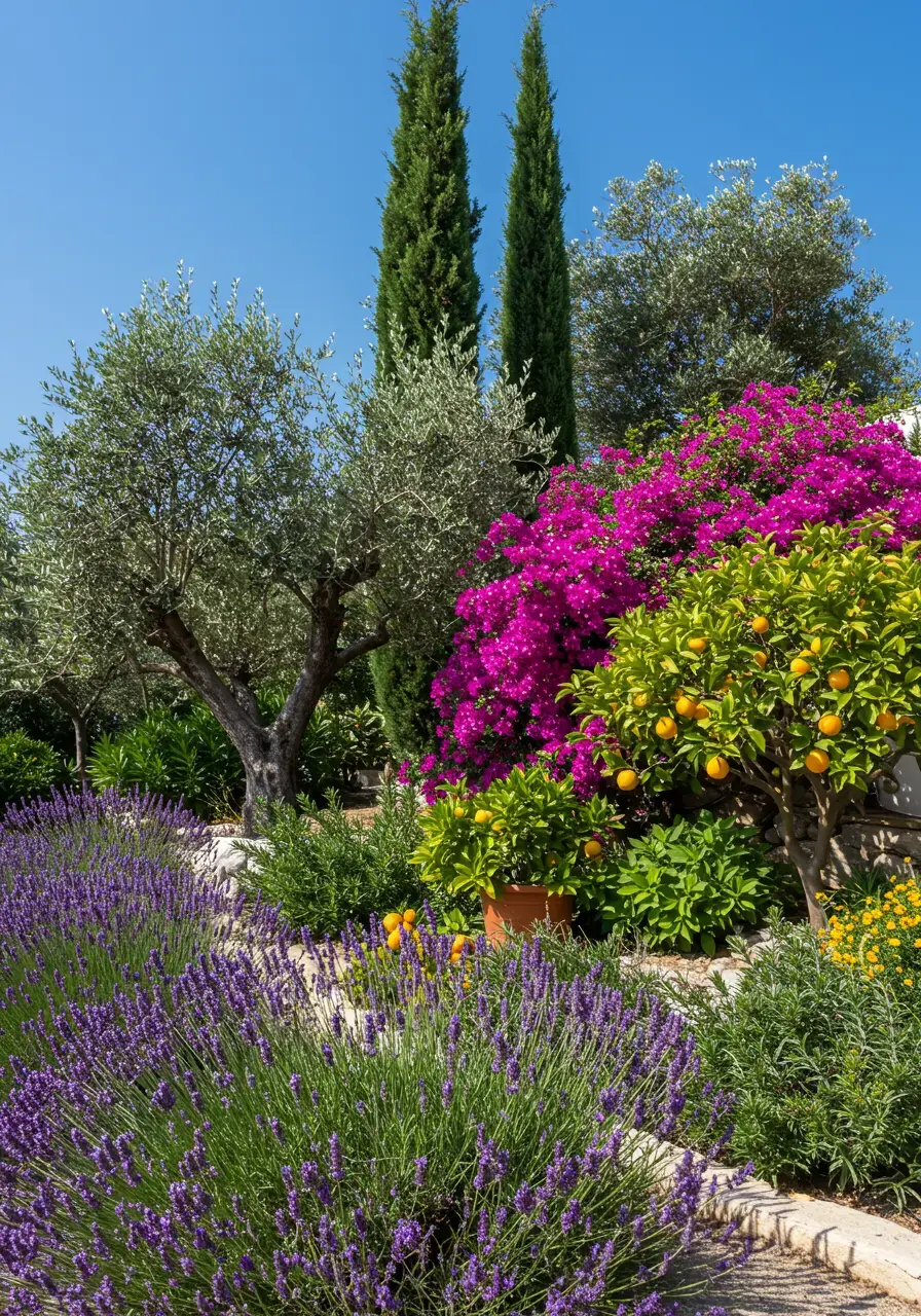 - Focus on plants like lavender, olive trees, cypress trees, citrus trees, rosemary, bougainvillea, and succulents.