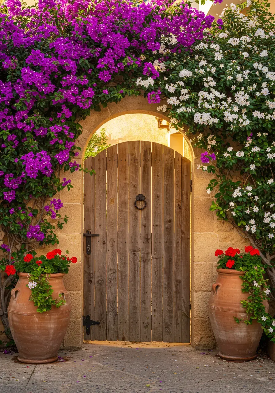 - Frame the entrance with fragrant climbing plants like jasmine, bougainvillea, or honeysuckle.