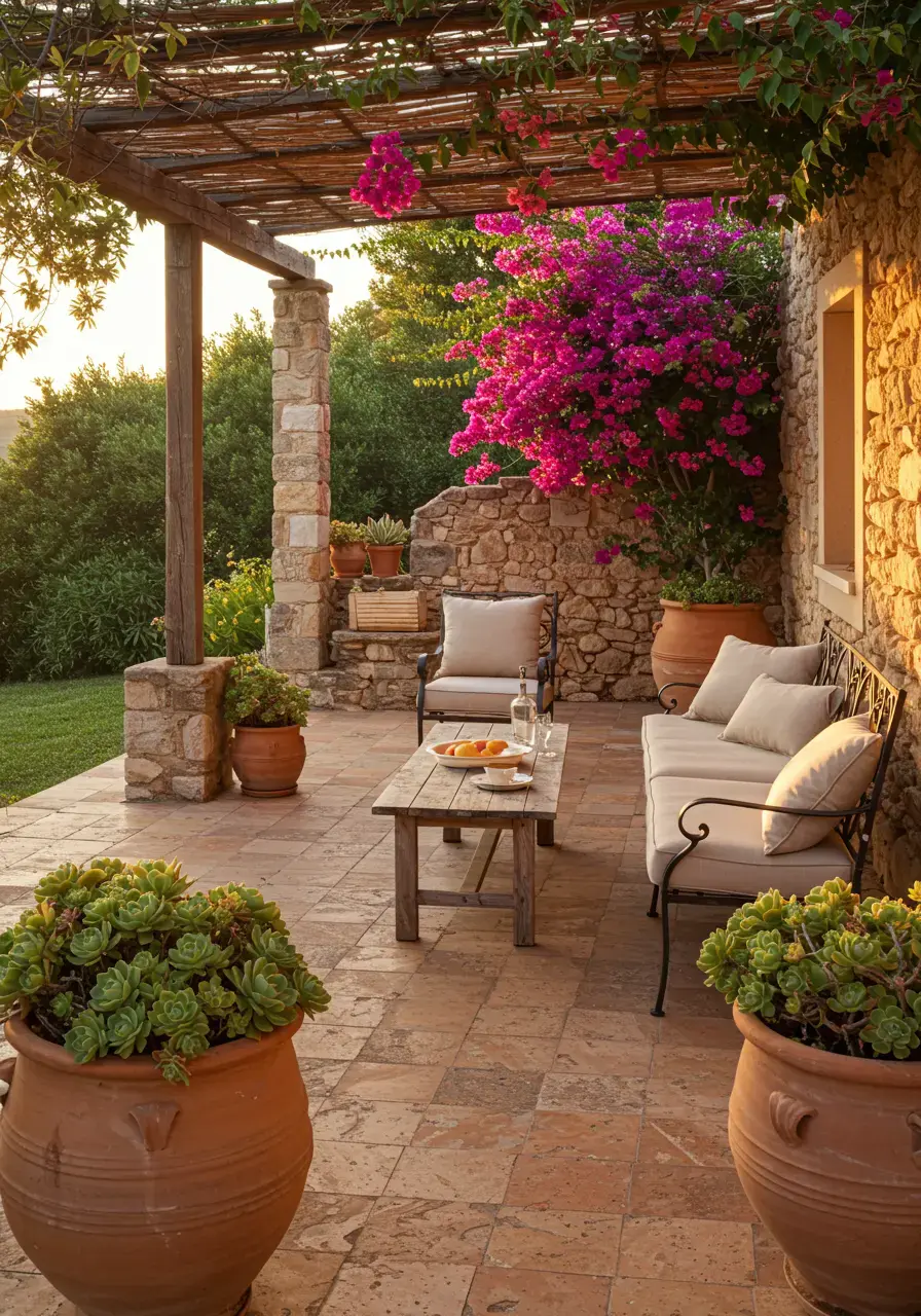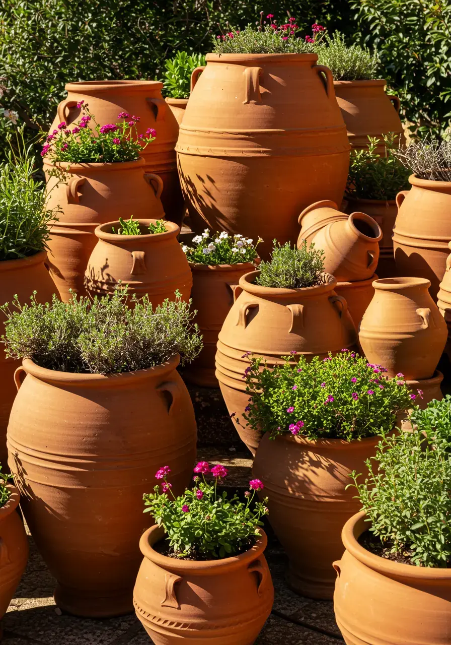 Terracotta pots are iconic to Mediterranean design, adding warmth, texture, and versatility for container planting. They help drain water effectively, which benefits many Mediterranean plants.
