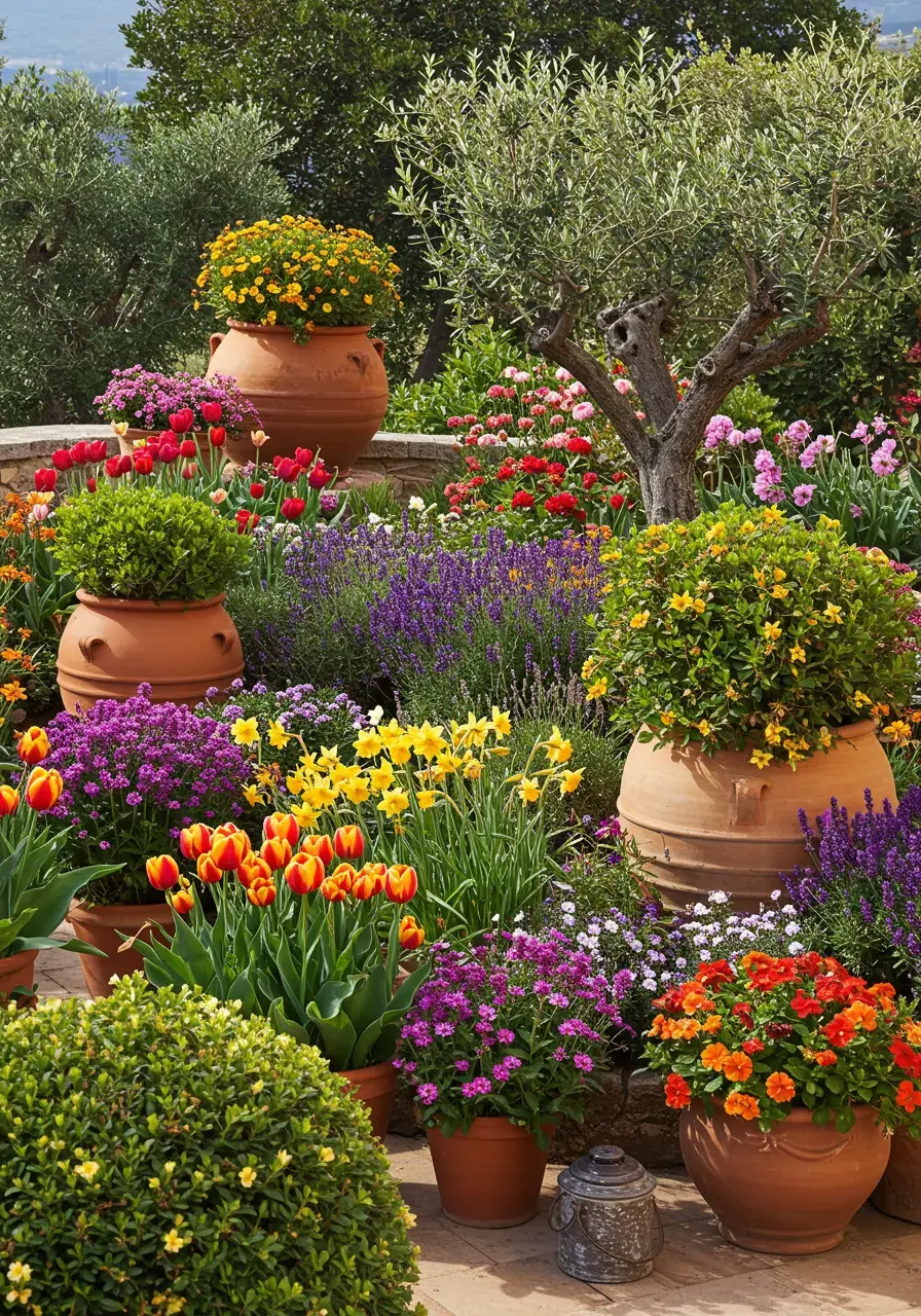 Vibrant flowers add splashes of color and visual interest, attracting pollinators and enhancing the lively, sun-drenched feel of the Mediterranean.
