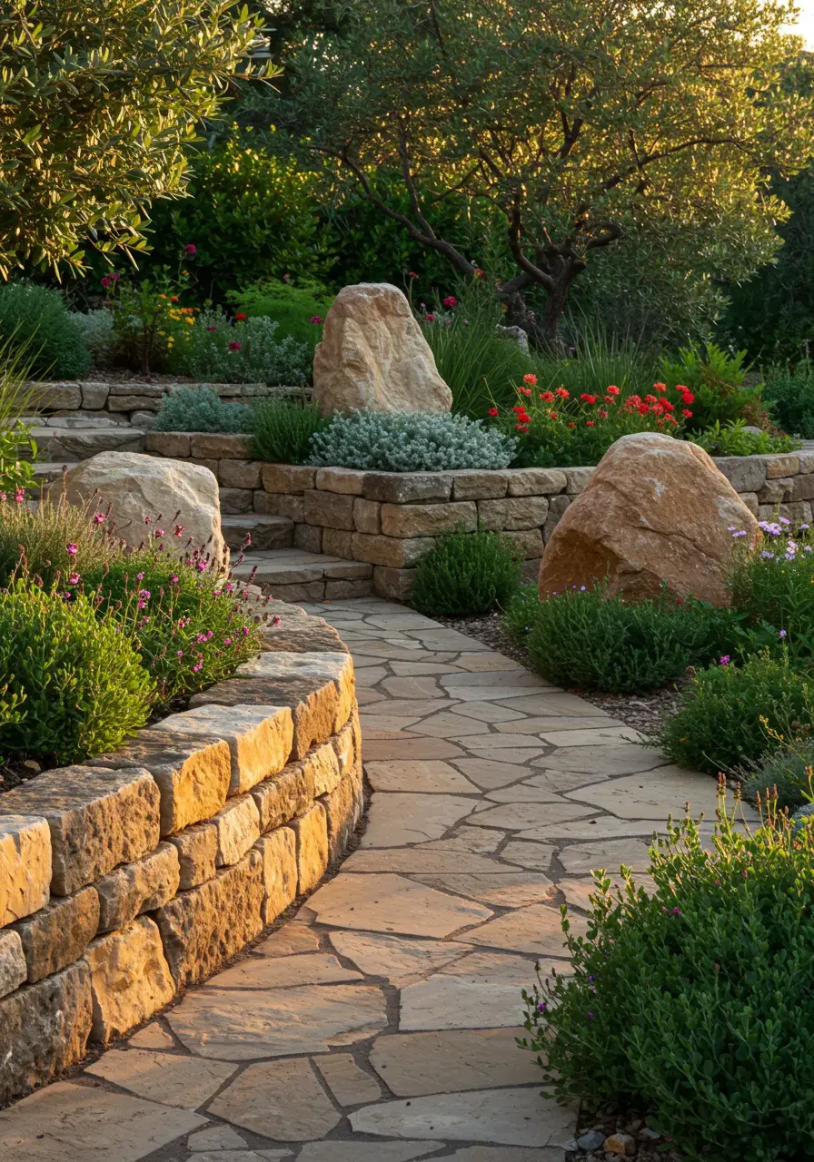 Natural stone just feels so grounded and authentic, doesn’t it? It’s a hallmark of Mediterranean architecture and landscaping. Whether it’s in pathways, walls, or even decorative features, stone adds texture, durability, and a sense of permanence to your garden. I love the way old stone ages and gets better with time.