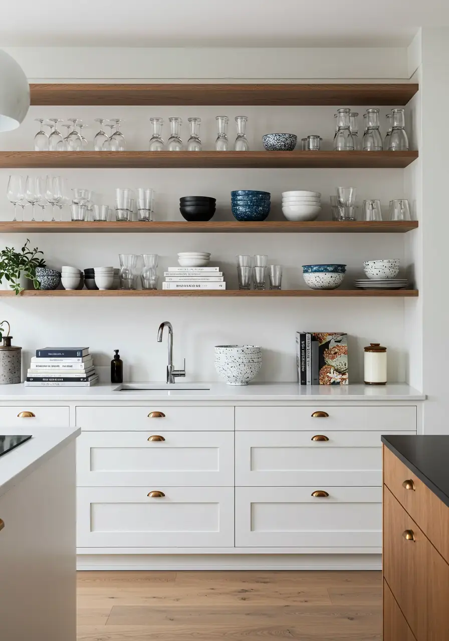 Open shelving adds a sense of openness and can make a kitchen feel larger. It offers a chance to add personality and display favorite items while keeping essentials within easy reach.