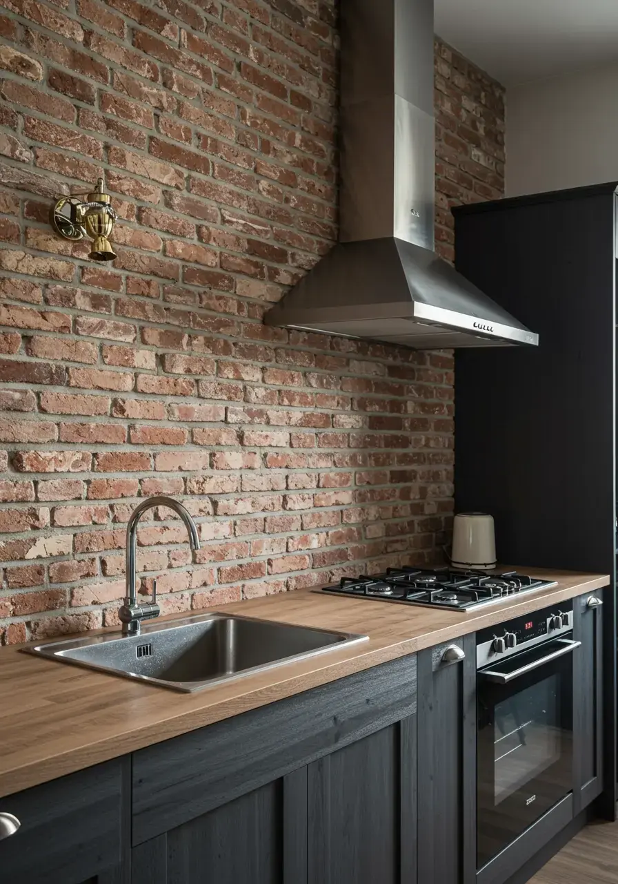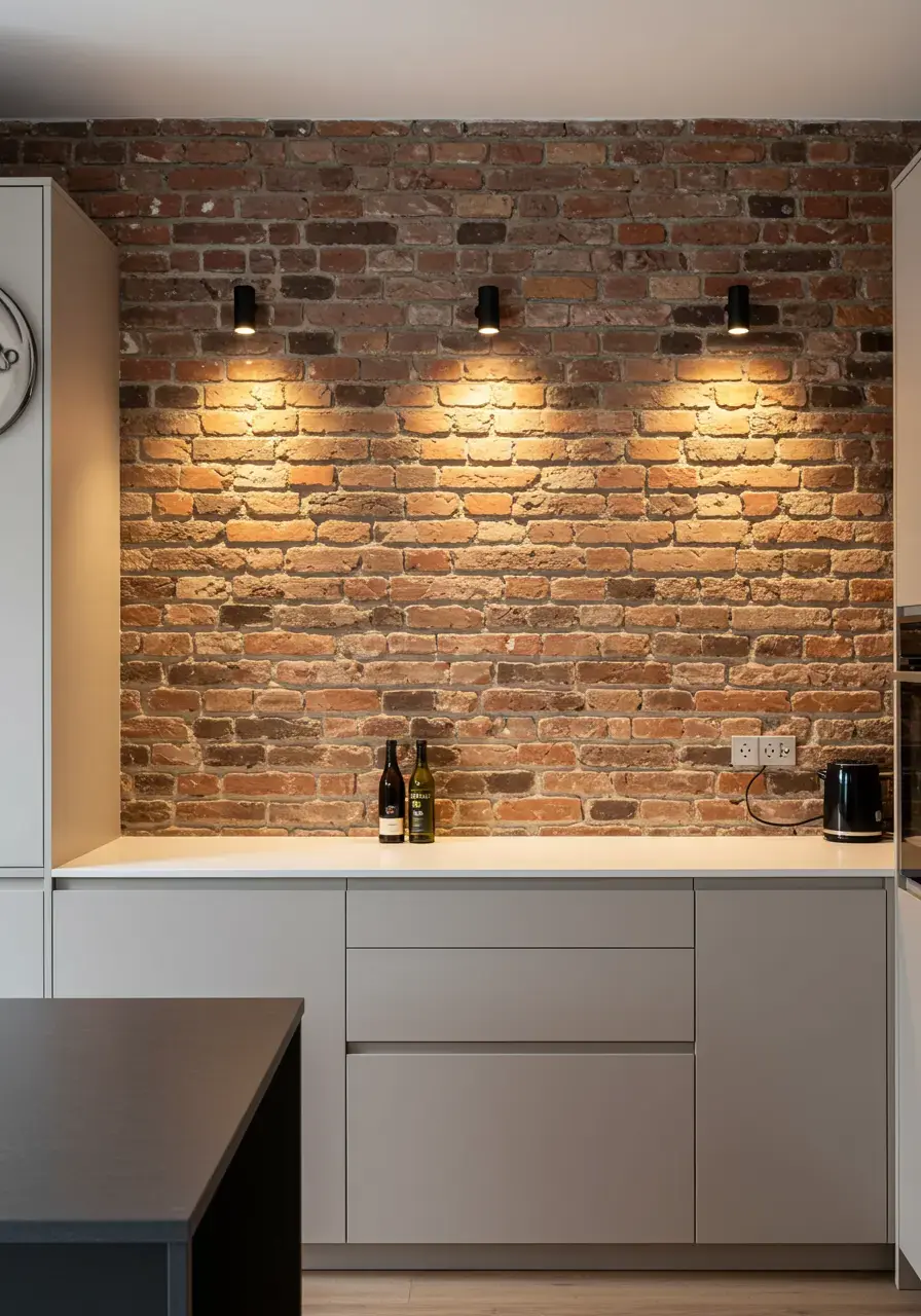 Exposed brick adds history, texture, and a touch of rugged authenticity. It creates a strong focal point and makes the kitchen feel instantly cooler.