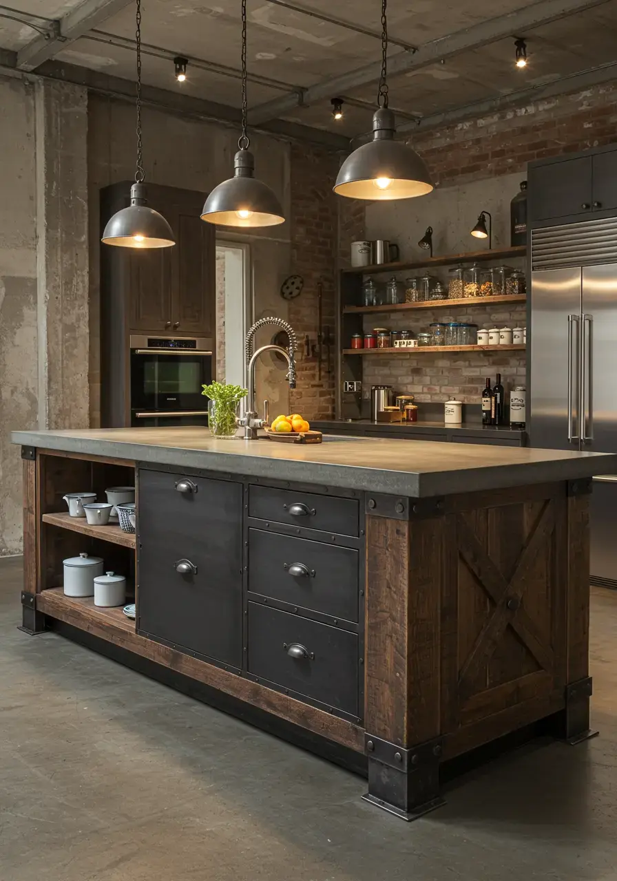 An industrial island provides ample workspace and can serve as a visual anchor. It can also offer additional storage and seating.