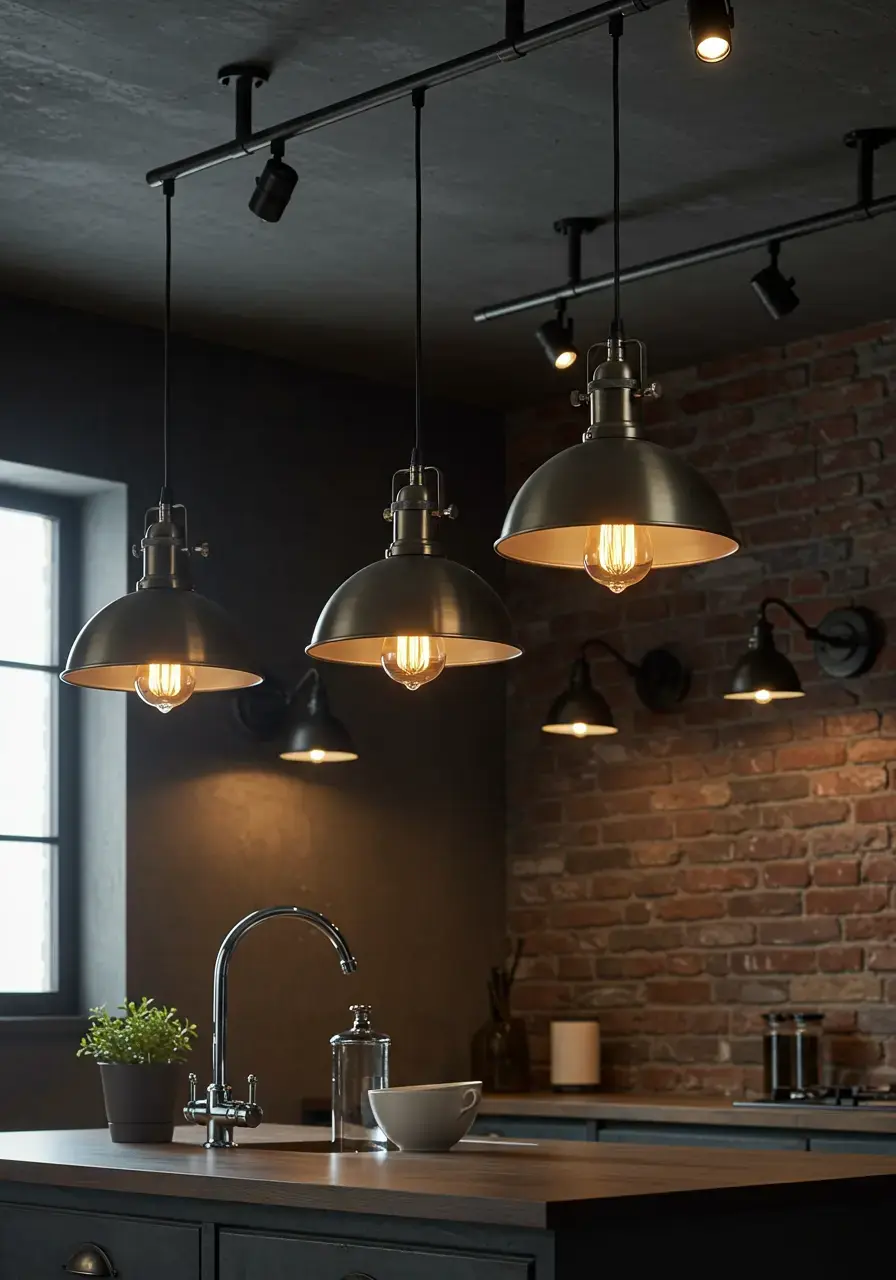 - Install pendant lights with metal shades or exposed bulbs over an island or table.