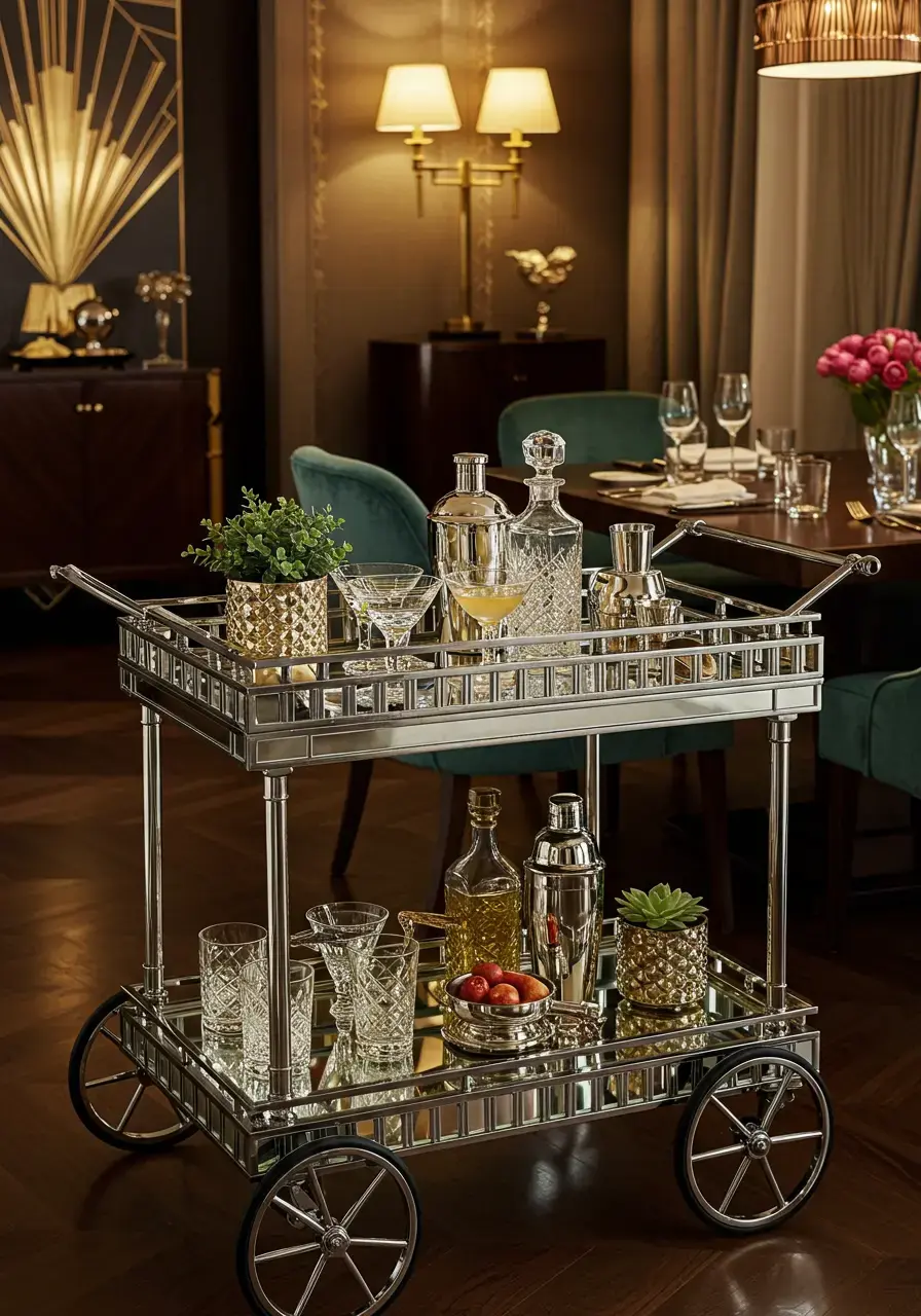 A mirrored bar cart adds functionality for entertaining, introduces a glamorous reflective surface, and serves as a decorative element that enhances the luxurious and social atmosphere typical of an Art Deco dining space.