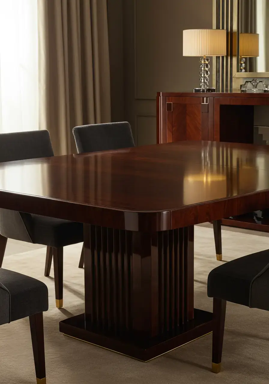 A polished wood table adds warmth, natural beauty, and a sense of permanence. The polished finish enhances the luxurious feel and complements the reflective surfaces common in Art Deco design, such as mirrors and metallics.