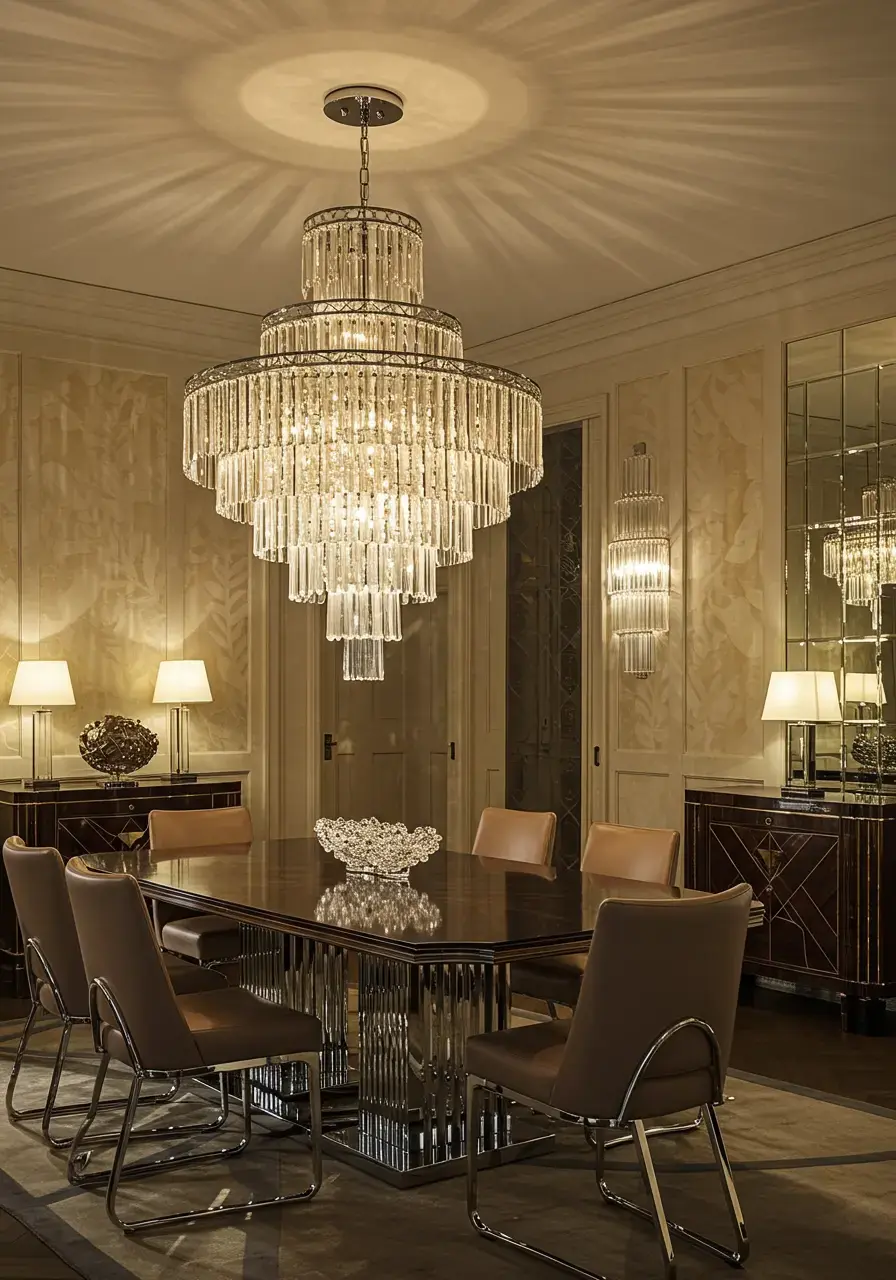 Dramatic lighting serves as a focal point, provides essential ambient and task lighting for dining, and reinforces the luxurious and theatrical nature of Art Deco design through sparkling materials and striking forms.