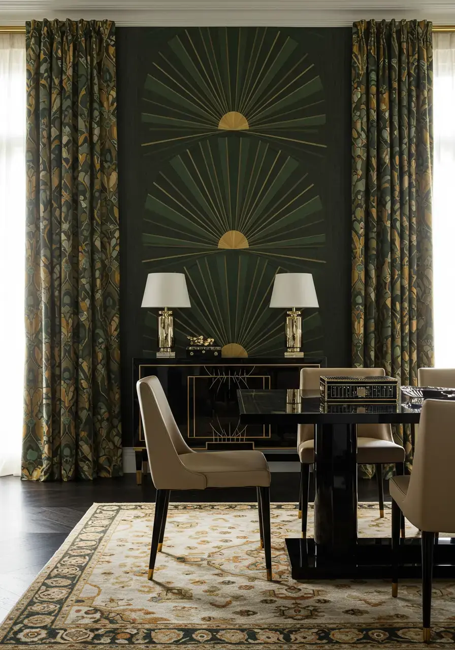 Inspired wall treatments provide a crucial backdrop for your Art Deco dining room, enhancing the thematic atmosphere and adding visual depth and interest.
