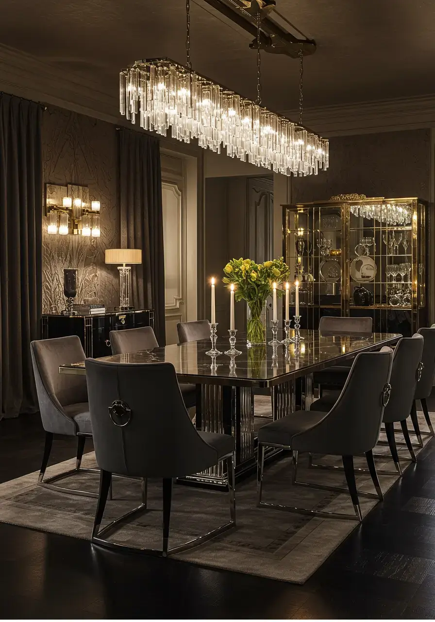 Perfect lighting sets the mood, enhances the luxurious feel, and highlights the elegant details of your Art Deco dining room, making the space feel grander and more inviting.