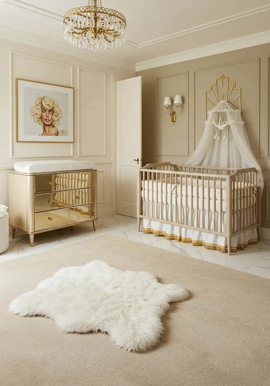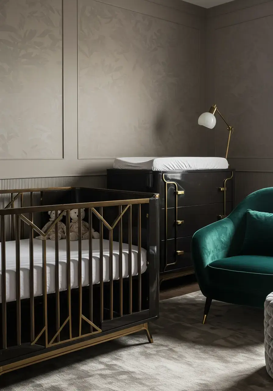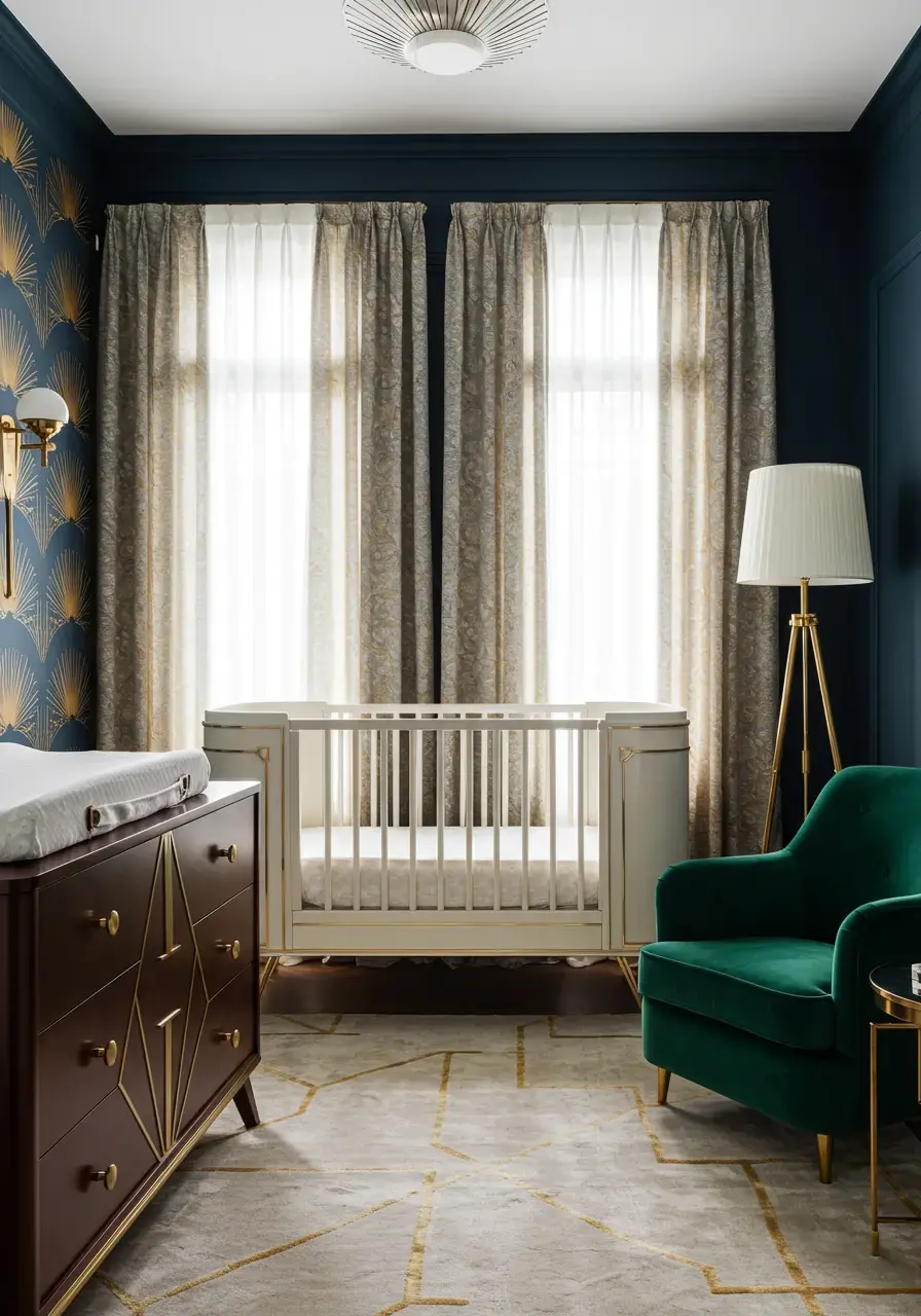 Infusing glamour elevates the nursery from merely functional to a sophisticated and enchanting space that reflects the luxurious essence of Art Deco.