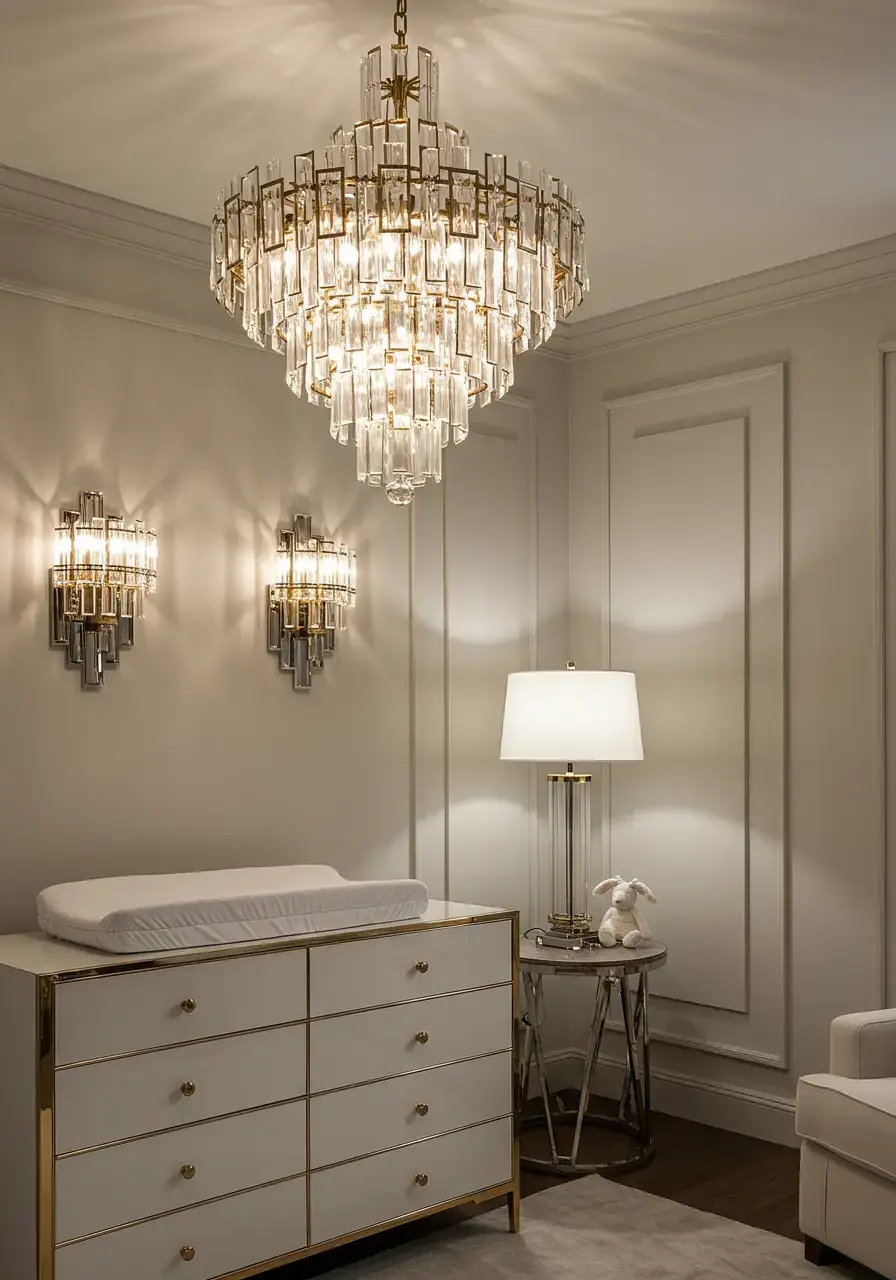 Layered and stylistic lighting enhances the glamorous and sophisticated atmosphere, making the nursery feel warm, inviting, and visually stunning day and night.
