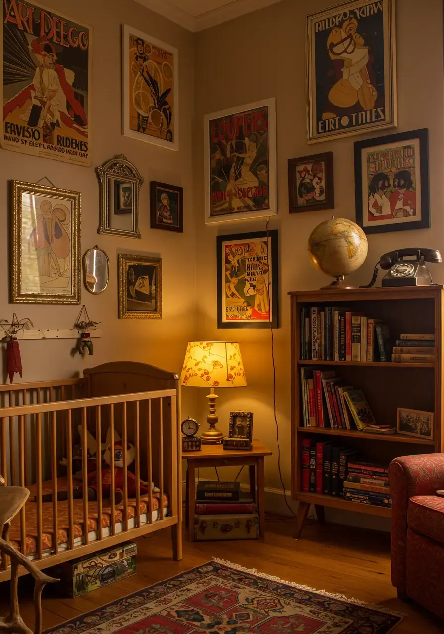Vintage finds add authenticity, character, and a unique, storied charm to the Art Deco nursery, making it feel truly one-of-a-kind.