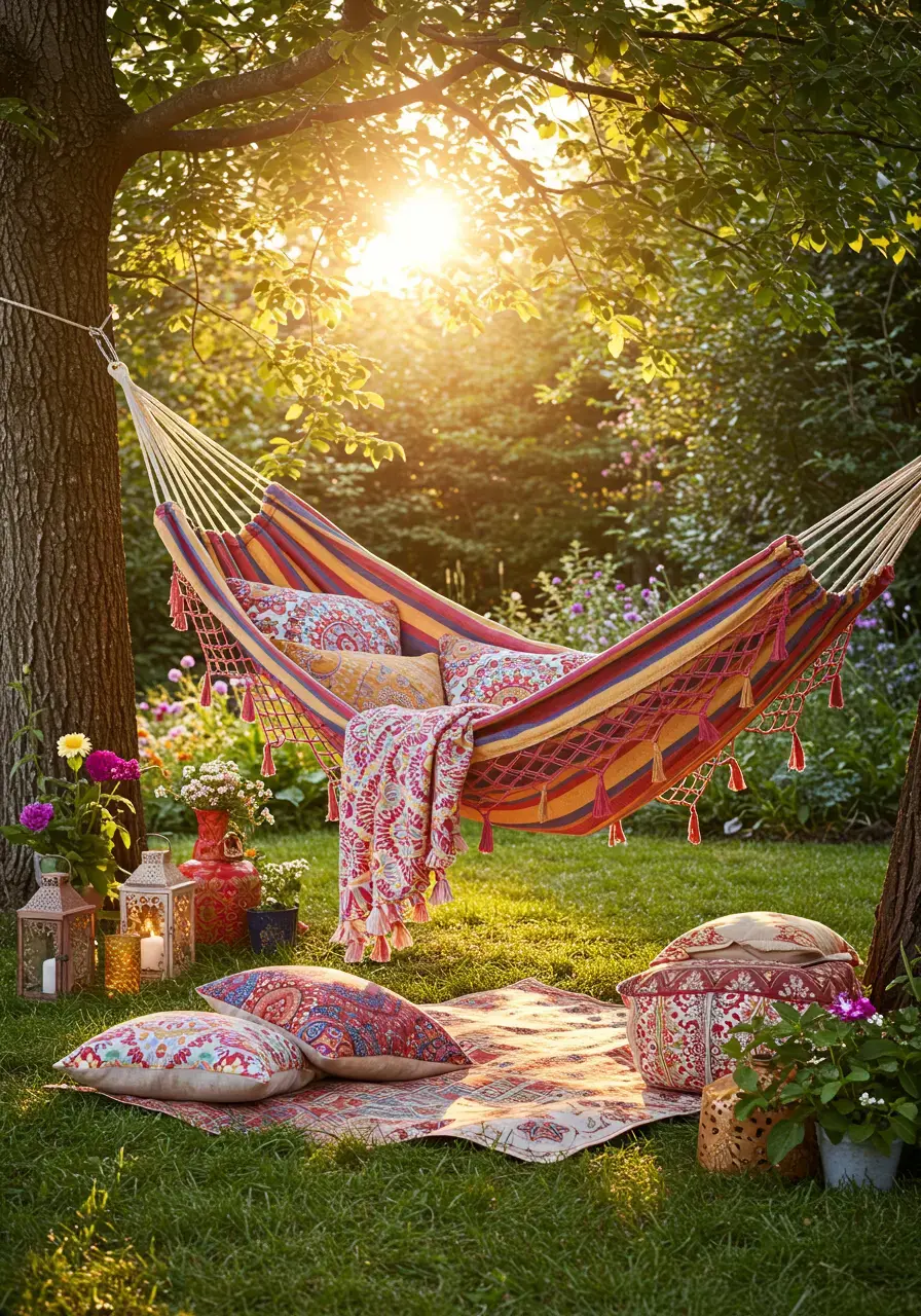 A hammock is the ultimate symbol of relaxation and leisure, perfectly embodying the carefree and inviting spirit of a bohemian garden.