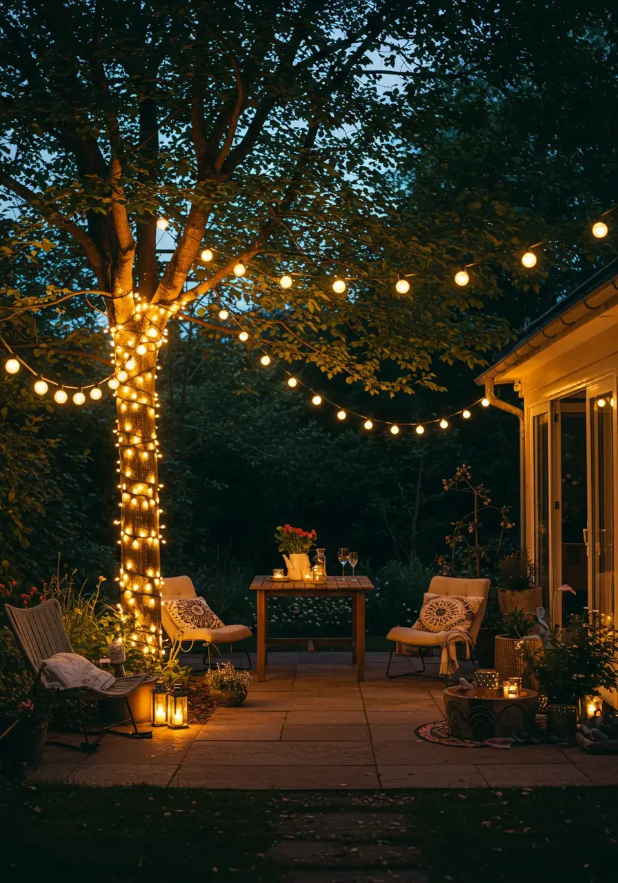 String lights add a whimsical and romantic element, creating a warm, inviting glow that enhances the magical quality of a bohemian garden after dark.