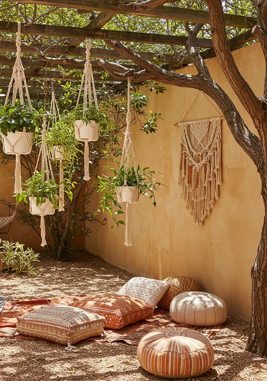 Macramé just screams bohemian, doesn’t it? Those intricate knots add such wonderful texture and an artisanal touch to any space, and gardens are no exception! Whether it’s a plant hanger or a decorative wall hanging (if you have a sheltered spot), macramé brings a handcrafted, earthy feel.