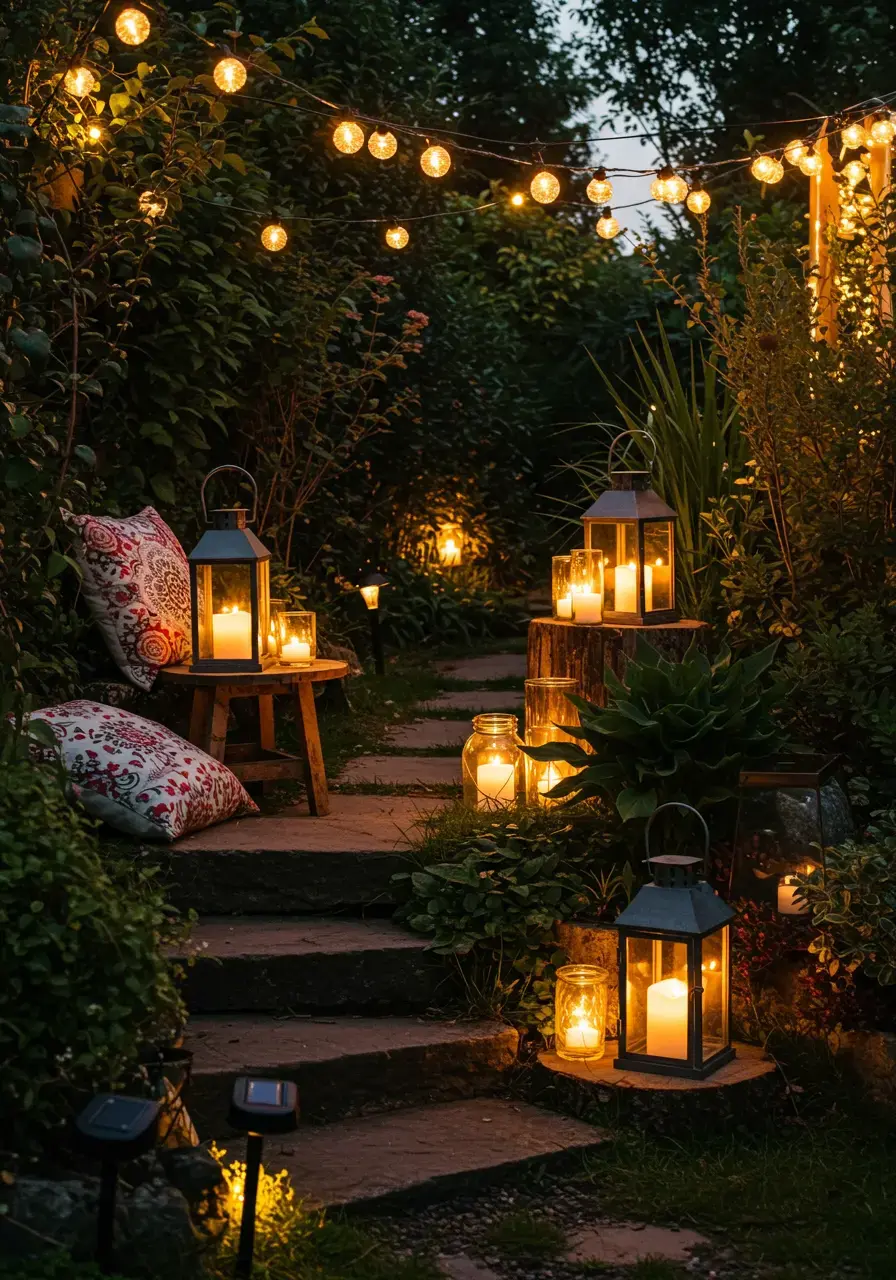 - Place lanterns with LED candles or real candles (safely!) on tables, steps, or scattered among plants.