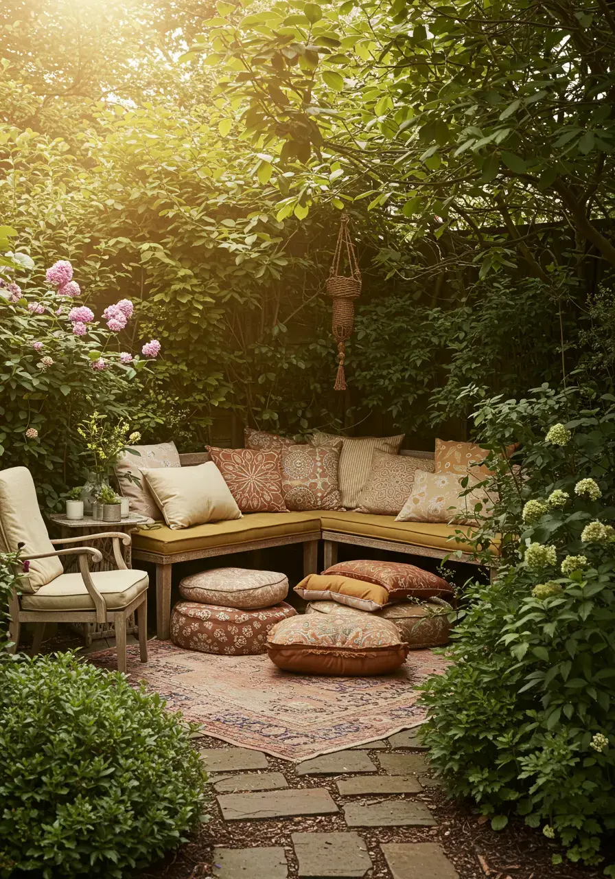 Every bohemian garden needs a spot where you can truly relax and connect with nature, and a cozy seating nook is just the thing. It doesn’t have to be fancy; it just needs to feel comfortable and sheltered. I like setting these up in a corner or under a tree, somewhere that feels a little more intimate.