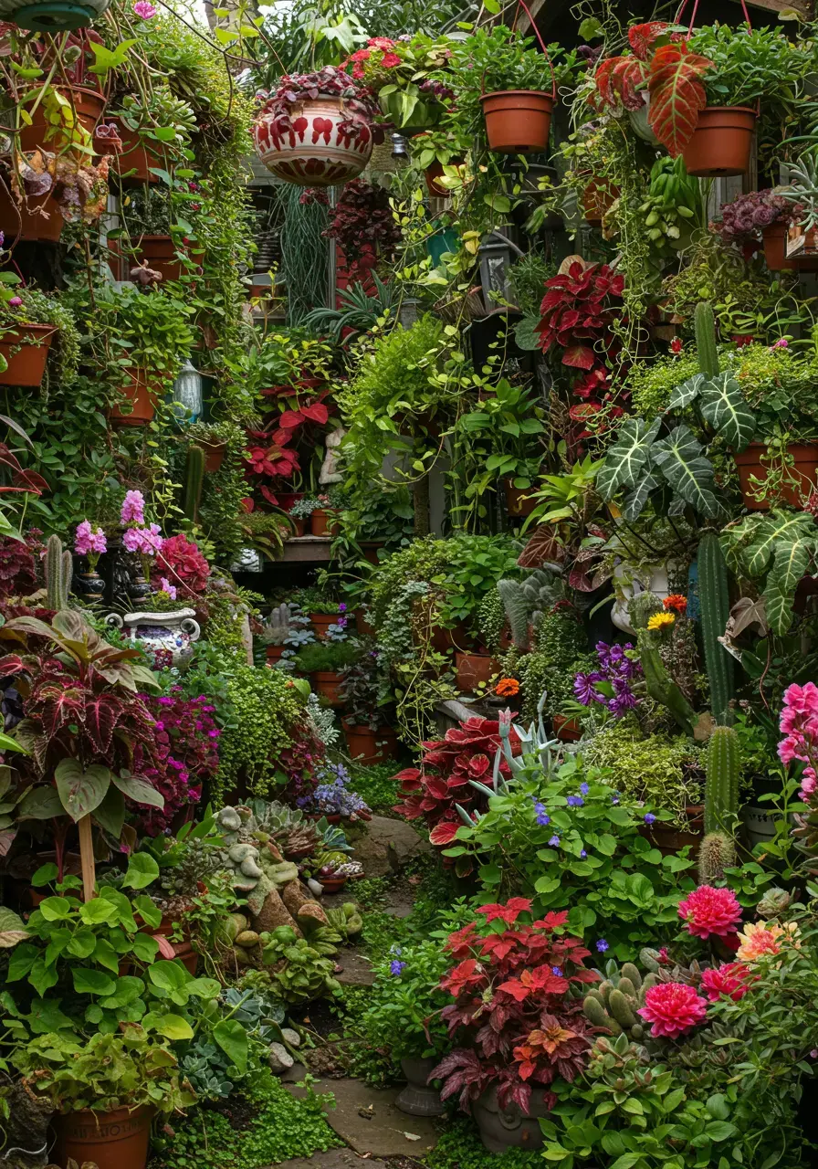 - Mix flowering plants, leafy greens, and even some succulents or cacti for texture.