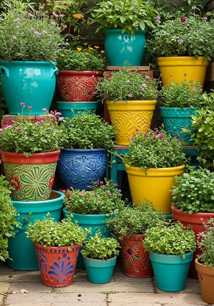 - Mix materials like glazed ceramic, terracotta, and painted metal.