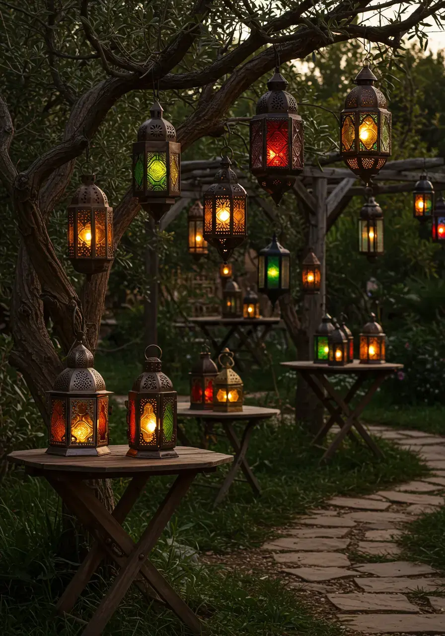 Moroccan lanterns provide exotic flair, casting beautiful, intricate shadows and creating a warm, inviting, and magical ambiance perfect for evening relaxation. They add a touch of romance.