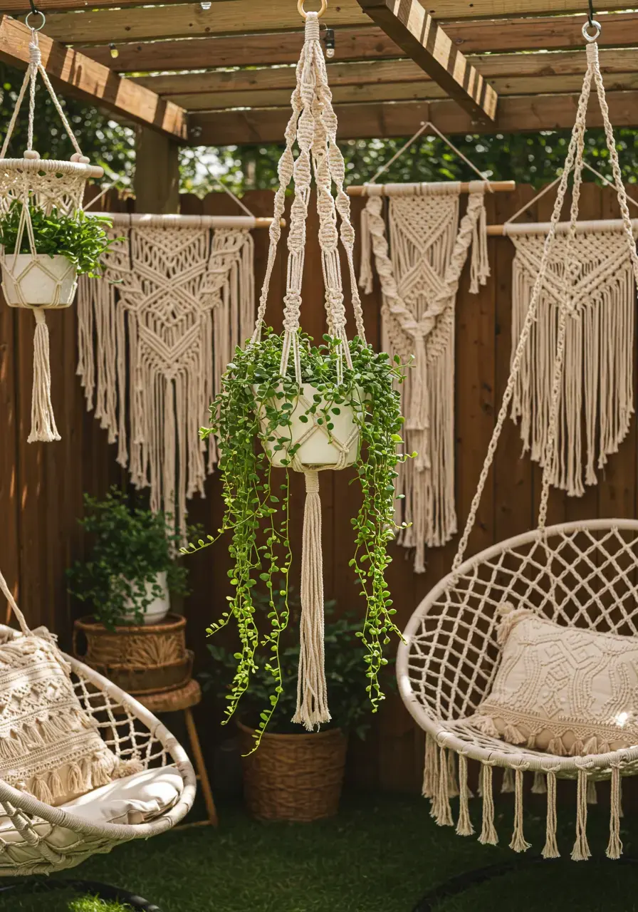 - Use macrame wall hangings or decorative panels on fences or pergolas.