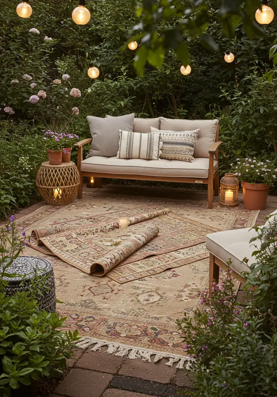 One of my absolute favorite tricks for making any space feel instantly cozier, especially an outdoor one, is layering rugs. It just adds so much warmth, texture, and visual depth. In a Boho garden, it ties everything together, making your seating area feel like a true outdoor living room. It’s an inviting touch that just begs you to kick off your shoes and stay a while.