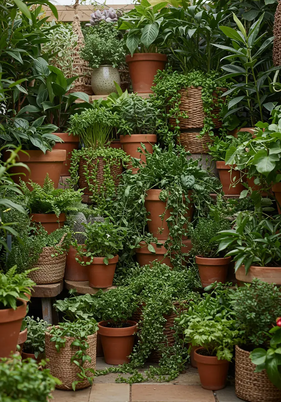 - Use a mix of terracotta, ceramic, and woven baskets as planters.